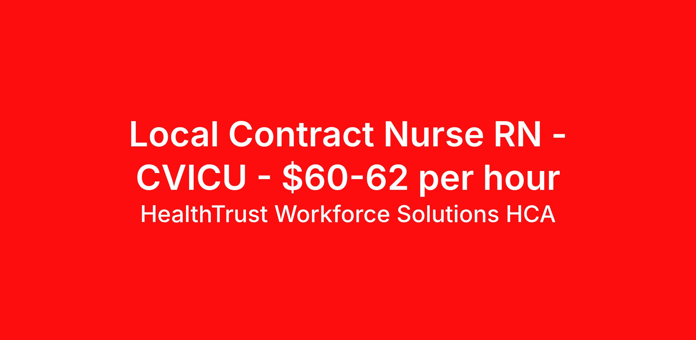 HealthTrust Workforce Solutions HCA is seeking a local contract nurse RN CVICU for a local contract nursing job in Plano, Texas. Job Description & Requirements Specialty: CVICU Discipline: RN Duration: 13 weeks 36 hours per week Shift: 12 hours, days Employment Type: Local Contract Position - TRAVEL - RN CVICU (652)/ MC Plano / 7A-7P (956968) About HealthTrust Workforce Solutions HCA At HealthTrust Workforce Solutions, healthcare is not just about the four walls of a facility but about the people who provide and receive care. Our focus is on empowering healthcare professionals to deliver exceptional patient experiences by providing them with the necessary skills, tools, and support. We partner with healthcare facilities nationwide to ensure that the right professionals are in the right roles. We prioritize our clinicians by giving them a voice and access to opportunities to fulfill their mission of improving lives by providing quality patient care. We are committed to our core values of Trust, Innovation, Adaptability, Courage, and Accountability. We are dedicated to positively impacting the healthcare industry by providing first-priority access to more than 200,000 jobs nationwide to our healthcare professionals. Join us and be part of the HealthTrust family, where you can make a difference every day. We embrace our changing environment, and we maintain a culture that has a rich tradition of transforming itself to meet the challenges of the future. MISSION STATEMENT While putting great people in the right roles is essential, our mission is far greater. We want our clinicians to be part of the HealthTrust family, where healthcare professionals have a voice and are empowered with the right tools and opportunities to fulfill their personal mission of improving lives. Plus, as a preferred partner to thousands of top-performing hospitals, we provide our healthcare professionals with first-priority access to more than 200,000 jobs nationwide. Benefits Dental benefits Vision benefits Referral bonus Continuing Education Life insurance