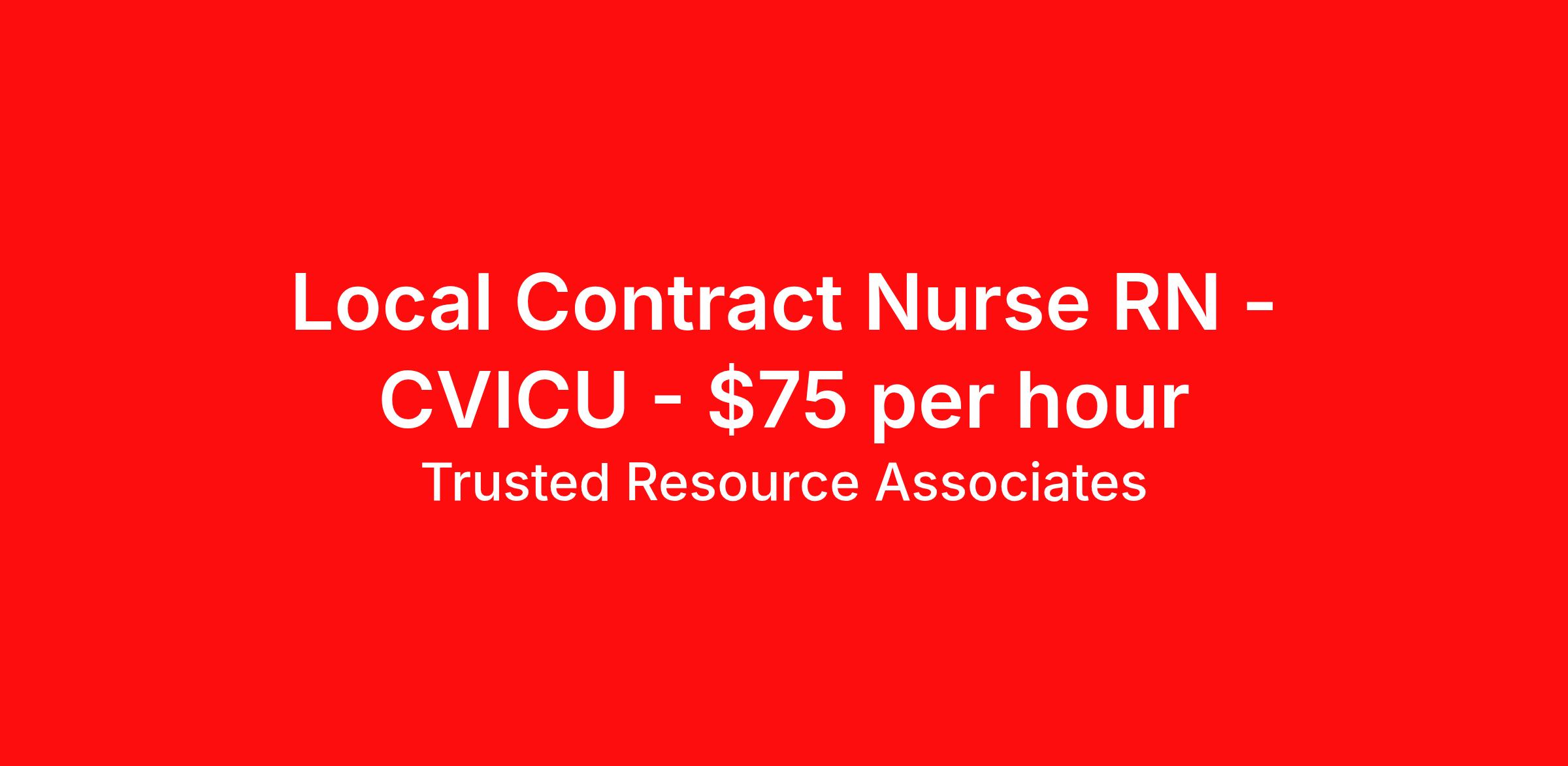 Trusted Resource Associates (TRA) is seeking a local contract nurse RN CVICU for a local contract nursing job in Rock Hill, South Carolina. Job Description & Requirements Specialty: CVICU Discipline: RN Start Date: 04/01/2026 Duration: 13 weeks 36 hours per week Shift: 12 hours, nights Employment Type: Local Contract TRA RN CVICU TRA is Tenet's in-house nationwide contingent pool for Nursing and Allied travel and local contracts. Receive a greater level of Contract security compared to with an outside agency. BENEFITS - Guaranteed hours for Travel Contracts - Preferred Booking Agreement for Local Contracts - Weekly Pay - Holiday Pay - Contract Security compared to a contract with an outside agency Minimum education Graduate of an accredited School of nursing Minimum Experience Must have 2 years of Acute Care nursing experience with a minimum one year current in the CVICU Required Certification/Licensure - Must be currently licensed, certified or registered to practice profession as required by law, regulation in state of practice or policy. Must meet all certification requirements for each nursing specialty supported - American Heart Association - CPR-Basic Life Support - Other credentialing items, such as a skills checklist and health related documents, which will be specified by your Recruiter. Our Hire Process - We do qualify our clinicians to meet or exceed the minimum requirements of a travel or local assignment. If you are qualified, we may direct-hire you, reducing the time we can get you to work! When you reach out to a TRA Recruiter for more details, ensure your Vivian profile includes your most updated resume! Trusted Resource Associates (TRA) Job ID 500216. Benefits 401k retirement plan Weekly pay Holiday Pay Referral bonus