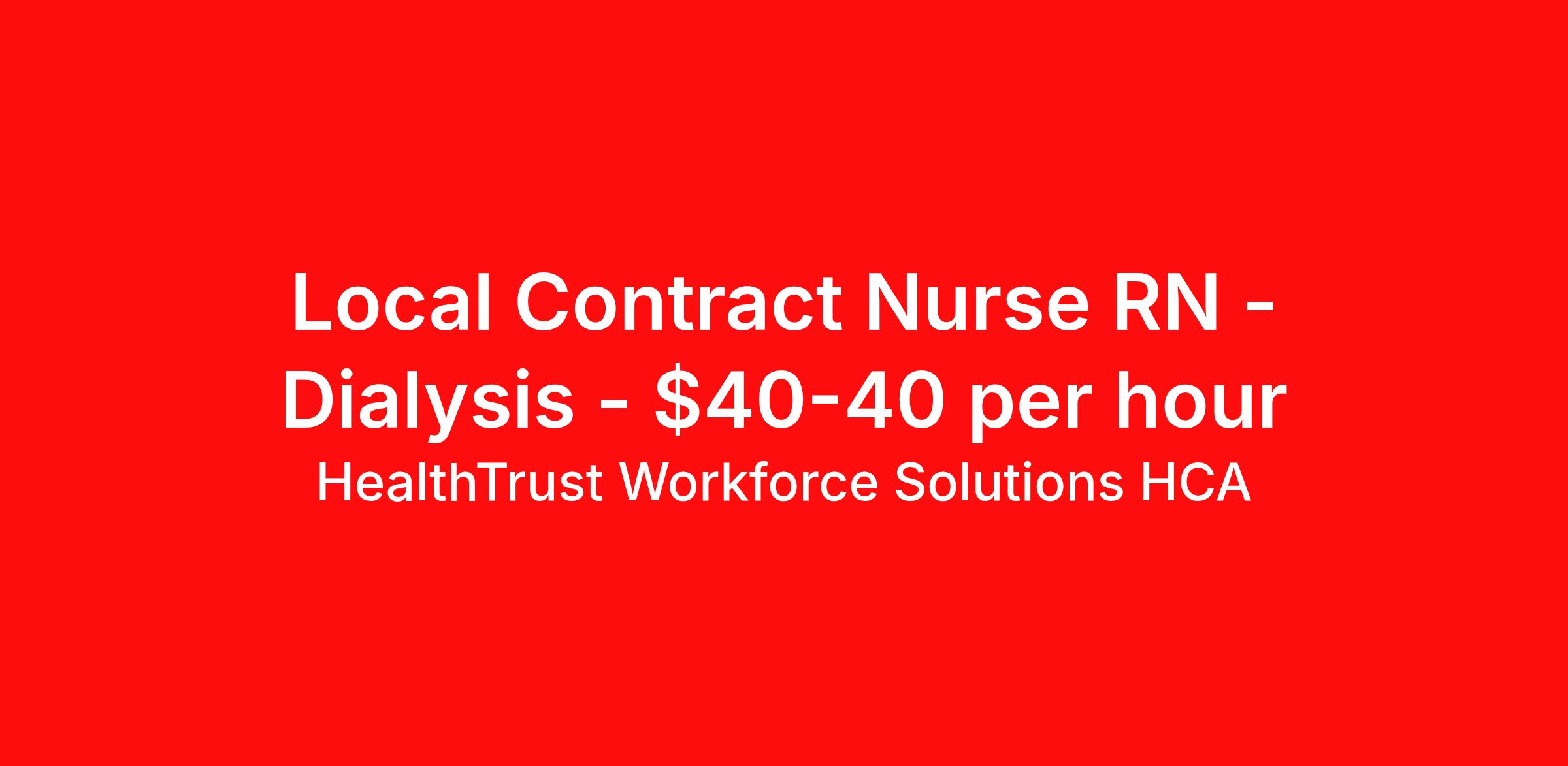 HealthTrust Workforce Solutions HCA is seeking a local contract nurse RN Dialysis for a local contract nursing job in Idaho Falls, Idaho. Job Description & Requirements Specialty: Dialysis Discipline: RN Start Date: 03/30/2026 Duration: 52 weeks 12 hours per week Shift: 12 hours, days, evenings, flexible Employment Type: Local Contract PRN Dialysis RN to Eastern Idaho Regional Medical Center, 3100 Channing Way, Idaho Falls, ID 83404 . Must have a minimum of 1 year of recent acute dialysis RN experience. Salary is set at $40.00 per hour minimum 1 day per week. Unencumbered State license and a BLS card. shifts are generally 7am to 7pm. for PRN only 401k is available. but full benefits are available to full time employees. HealthTrust Workforce Solutions is a leading provider of healthcare jobs nationwide. As a wholly-owned subsidiary of HCA Healthcare, the nation’s largest health system, we provide access to more opportunities in more locations. When you work with HWS, you unlock possibilities, raise the bar and become a part of a team that cares like family. HealthTrust Workforce Solutions is a wholly-owned subsidiary of HCA Healthcare. HealthTrust is a preferred partner to thousands of top-performing hospitals providing our healthcare professionals with first-priority access to more than 200,000 jobs nationwide. About HealthTrust Workforce Solutions HCA At HealthTrust Workforce Solutions, healthcare is not just about the four walls of a facility but about the people who provide and receive care. Our focus is on empowering healthcare professionals to deliver exceptional patient experiences by providing them with the necessary skills, tools, and support. We partner with healthcare facilities nationwide to ensure that the right professionals are in the right roles. We prioritize our clinicians by giving them a voice and access to opportunities to fulfill their mission of improving lives by providing quality patient care. We are committed to our core values of Trust, Innovation, Adaptability, Courage, and Accountability. We are dedicated to positively impacting the healthcare industry by providing first-priority access to more than 200,000 jobs nationwide to our healthcare professionals. Join us and be part of the HealthTrust family, where you can make a difference every day. We embrace our changing environment, and we maintain a culture that has a rich tradition of transforming itself to meet the challenges of the future. MISSION STATEMENT While putting great people in the right roles is essential, our mission is far greater. We want our clinicians to be part of the HealthTrust family, where healthcare professionals have a voice and are empowered with the right tools and opportunities to fulfill their personal mission of improving lives. Plus, as a preferred partner to thousands of top-performing hospitals, we provide our healthcare professionals with first-priority access to more than 200,000 jobs nationwide. Benefits Dental benefits Vision benefits Referral bonus Continuing Education Life insurance