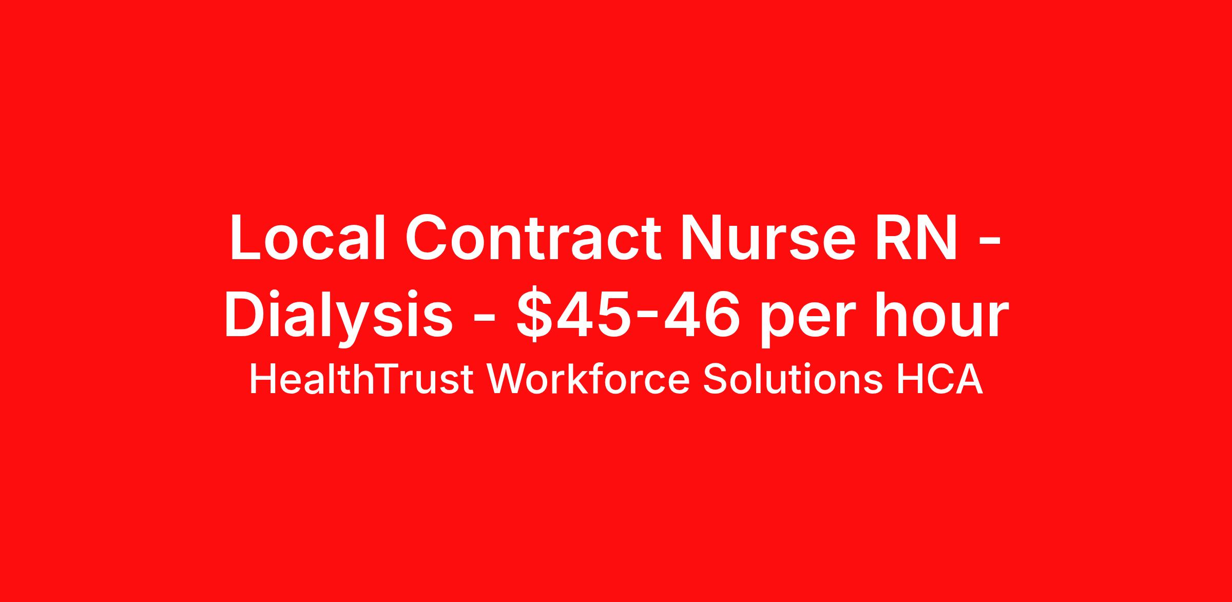 HealthTrust Workforce Solutions HCA is seeking a local contract nurse RN Dialysis for a local contract nursing job in Blacksburg, Virginia. Job Description & Requirements Specialty: Dialysis Discipline: RN Start Date: 03/30/2026 Duration: 52 weeks 12 hours per week Shift: 12 hours, days, evenings, flexible Employment Type: Local Contract PRN Dialysis RN to HCA Hospitals in Salem VA. Must have a minimum of 1 year of recent acute dialysis RN experience. Salary is set at $45.50 per hour minimum 1 day per week. Unencumbered State license and a BLS card. shifts are generally 7am to 7pm. for PRN only 401k is available. but full benefits are available to full time employees. HealthTrust Workforce Solutions is a leading provider of healthcare jobs nationwide. As a wholly-owned subsidiary of HCA Healthcare, the nation’s largest health system, we provide access to more opportunities in more locations. When you work with HWS, you unlock possibilities, raise the bar and become a part of a team that cares like family. HealthTrust Workforce Solutions is a wholly-owned subsidiary of HCA Healthcare. HealthTrust is a preferred partner to thousands of top-performing hospitals providing our healthcare professionals with first-priority access to more than 200,000 jobs nationwide. About HealthTrust Workforce Solutions HCA At HealthTrust Workforce Solutions, healthcare is not just about the four walls of a facility but about the people who provide and receive care. Our focus is on empowering healthcare professionals to deliver exceptional patient experiences by providing them with the necessary skills, tools, and support. We partner with healthcare facilities nationwide to ensure that the right professionals are in the right roles. We prioritize our clinicians by giving them a voice and access to opportunities to fulfill their mission of improving lives by providing quality patient care. We are committed to our core values of Trust, Innovation, Adaptability, Courage, and Accountability. We are dedicated to positively impacting the healthcare industry by providing first-priority access to more than 200,000 jobs nationwide to our healthcare professionals. Join us and be part of the HealthTrust family, where you can make a difference every day. We embrace our changing environment, and we maintain a culture that has a rich tradition of transforming itself to meet the challenges of the future. MISSION STATEMENT While putting great people in the right roles is essential, our mission is far greater. We want our clinicians to be part of the HealthTrust family, where healthcare professionals have a voice and are empowered with the right tools and opportunities to fulfill their personal mission of improving lives. Plus, as a preferred partner to thousands of top-performing hospitals, we provide our healthcare professionals with first-priority access to more than 200,000 jobs nationwide. Benefits Dental benefits Vision benefits Referral bonus Continuing Education Life insurance