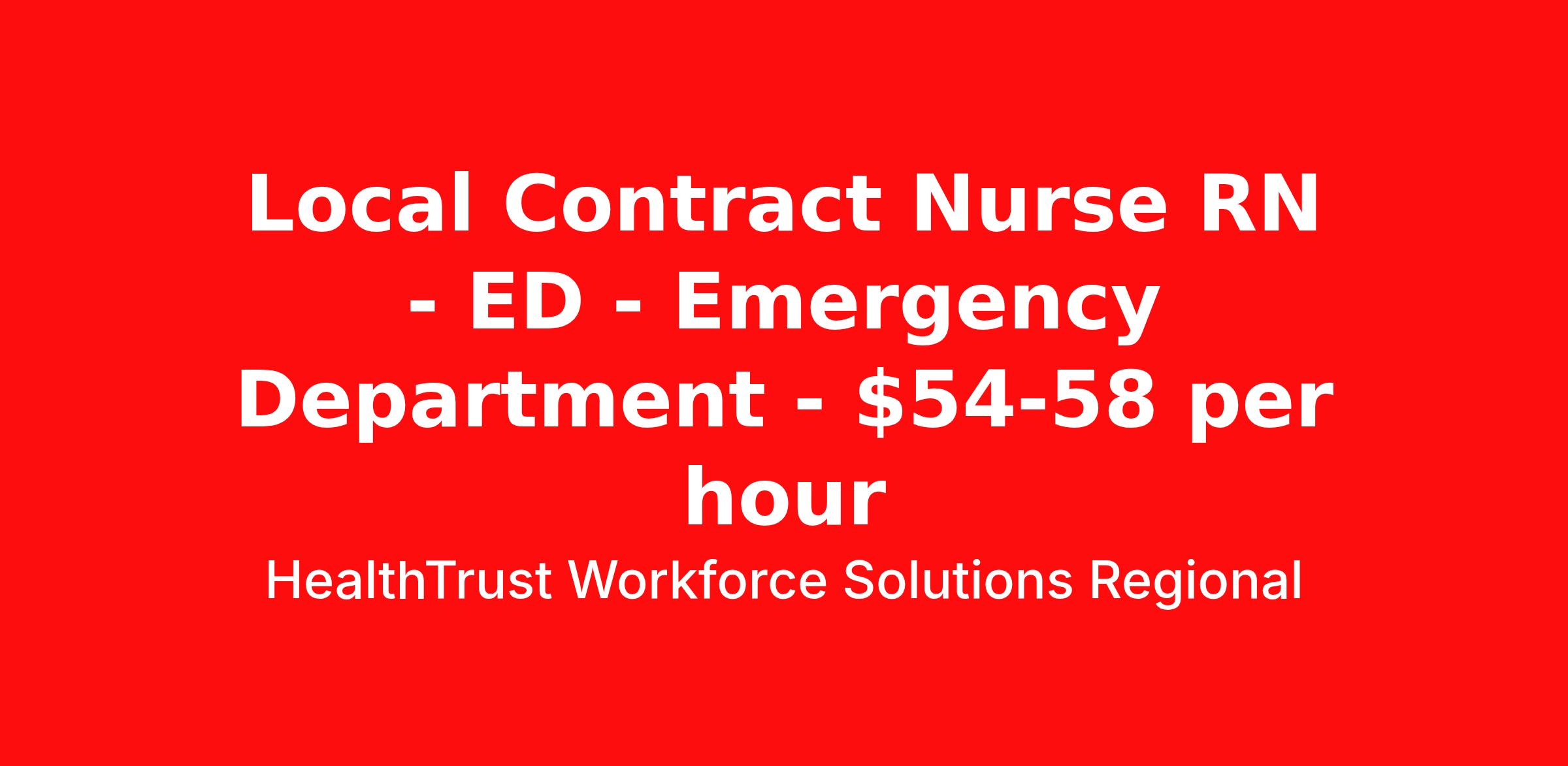 HealthTrust Workforce Solutions Regional is seeking a local contract nurse RN ED - Emergency Department for a local contract nursing job in Augusta, Georgia. Job Description & Requirements Specialty: ED - Emergency Department Discipline: RN Duration: 13 weeks 36 hours per week Shift: 12 hours, days, nights Employment Type: Local Contract REQUIRED CERTIFICATIONS: ACLS BLS PALS RN with 2 year acute care Hospital Experience. Must have an active RN license Must be available every other weekend We provide opportunities for Local or Travel contracts, and Per Diem positions across various cities and states. Message me for additional rates.