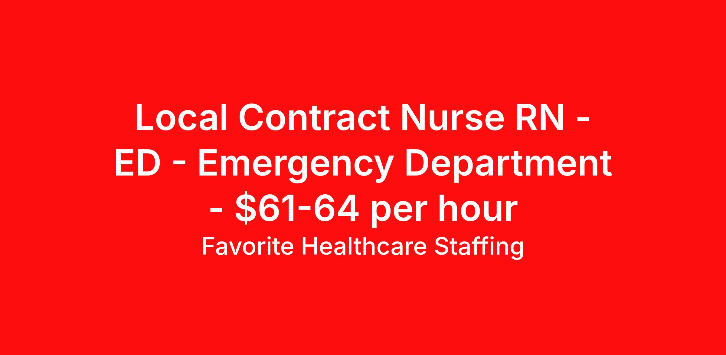 Favorite Healthcare Staffing is seeking a local contract nurse RN ED - Emergency Department for a local contract nursing job in Lawrence, Kansas. Job Description & Requirements Specialty: ED - Emergency Department Discipline: RN Duration: 13 weeks 36 hours per week Shift: 12 hours, nights Employment Type: Local Contract At Favorite Healthcare Staffing, we’re dedicated to discovering what fuels your passion as an Registered Nurse—and then matching you with the ideal opportunity. Our expert recruiters relish the challenge of crafting the perfect placement tailored to your skills and ambitions. From your first conversation onward, you’ll have a dedicated advocate championing your success at every step. Apply now to become part of the Favorite Family! We’re currently seeking a skilled Emergency Room RN for a 13-week contract in Lawrence, KS. If you have a minimum of 2 years' Emergency Room experience we want to hear from you! ER RN Position Details: • Contract Length: 13 Weeks • Location: Lawrence, KS • Facility Type: Hospital • Shift | Schedule: Nights; 12-hour shifts Pay Details: $64/hr ER RN Requirements: • minimum of 2 years' Emergency Room experience • Kansas/compact RN License required • Current BLS, ACLS, PALS, NIHSS, TNCC Perks of Traveling with Favorite: • Live Recruiters, Customer Service, & Tech Support 24/7/365 • Schedule Shifts & Submit Timecards on Favorite Mobile App • Referral Bonus Program, First Day Health Insurance, 401(k) Retirement Plans & Match • License & Continuing Education Reimbursement Join Favorite and unlock unparalleled opportunities to elevate your career, master cutting-edge skills, and immerse yourself in life-changing experiences—all while seeing the country. Connect with your dedicated Favorite Recruiter today and start exploring! About Favorite Healthcare Staffing Favorite Healthcare Staffing, part of Acacium Group, takes pride in connecting candidates with jobs that fit their unique needs. We place nursing, advanced practice, and allied healthcare professionals in top-rated hospitals, clinics, and physicians’ offices across the country. With thousands of per diem opportunities, local and travel contracts, or permanent and temp-to-perm placement jobs to choose from, our recruiters will help you discover the perfect position for you. Favorite continues to set the industry standard for quality, service, and integrity in healthcare staffing and services. Contact us today to find your dream job! Benefits Weekly pay Dental benefits 401k retirement plan Medical benefits Referral bonus License and certification reimbursement Employee assistance programs