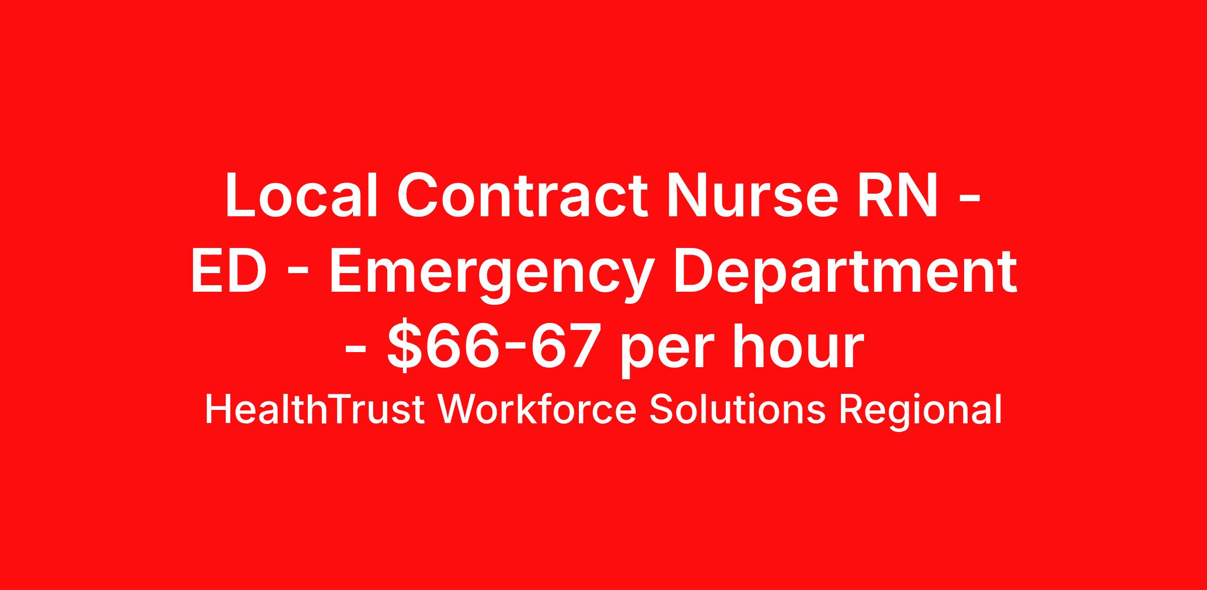 HealthTrust Workforce Solutions Regional is seeking a local contract nurse RN ED - Emergency Department for a local contract nursing job in Wichita, Kansas. Job Description & Requirements Specialty: ED - Emergency Department Discipline: RN Duration: 13 weeks 36 hours per week Shift: 12 hours, days, nights Employment Type: Local Contract We staff exclusively for all the HCA facilities in the Wichita, KS area. We currently have orders from Wesley Woodlawn Hospital and Wesley Medical Center. We also staff travel contracts and per diem positions, if you'd like to contact me about that please express your interest through Vivian so we can chat! Must Haves: - An ASN degree minimum, BSN preferred - A recent 12 months of ED RN experience in an acute inpatient hospital setting - Experience in traveling or experience at large facility areas. Able to keep up with our fast pace ER. - CO RN License - ACLS, BLS, PALS, NIH, CPI, and TNCC Certifications Preferred or Nice to Have: - MediTech Experience - Been to a 52 bed ER or larger