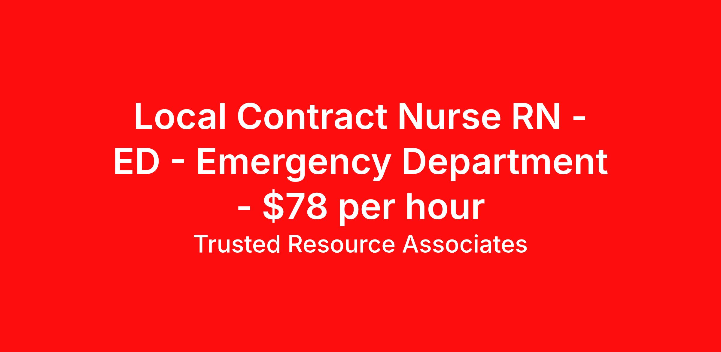 Trusted Resource Associates (TRA) is seeking a local contract nurse RN ED - Emergency Department for a local contract nursing job in Joshua Tree, California. Job Description & Requirements Specialty: ED - Emergency Department Discipline: RN Start Date: 04/01/2026 Duration: 13 weeks 36 hours per week Shift: 12 hours, nights Employment Type: Local Contract TRA RN Emergency Department TRA is Tenet's in-house nationwide contingent pool for Nursing and Allied travel and local contracts. Receive a greater level of Contract security compared to with an outside agency. BENEFITS - Guaranteed hours for Travel Contracts - Preferred Booking Agreement for Local Contracts - Weekly Pay - Holiday Pay - Contract Security compared to a contract with an outside agency Minimum education Graduate of an accredited School of nursing Minimum Experience Must have 2 years of Acute Care nursing experience with a minimum one year current in thie ED. Required Certification/Licensure - Must be currently licensed, certified or registered to practice profession as required by law, regulation in state of practice or policy. Must meet all certification requirements for each nursing specialty supported - American Heart Association - CPR-Basic Life Support - Other credentialing items, such as a skills checklist and health related documents, which will be specified by your Recruiter. Our Hire Process - We do qualify our clinicians to meet or exceed the minimum requirements of a travel or local assignment. If you are qualified, we may direct-hire you, reducing the time we can get you to work! When you reach out to a TRA Recruiter for more details, ensure your Vivian profile includes your most updated resume! Trusted Resource Associates (TRA) Job ID 500274. Benefits 401k retirement plan Weekly pay Holiday Pay Referral bonus