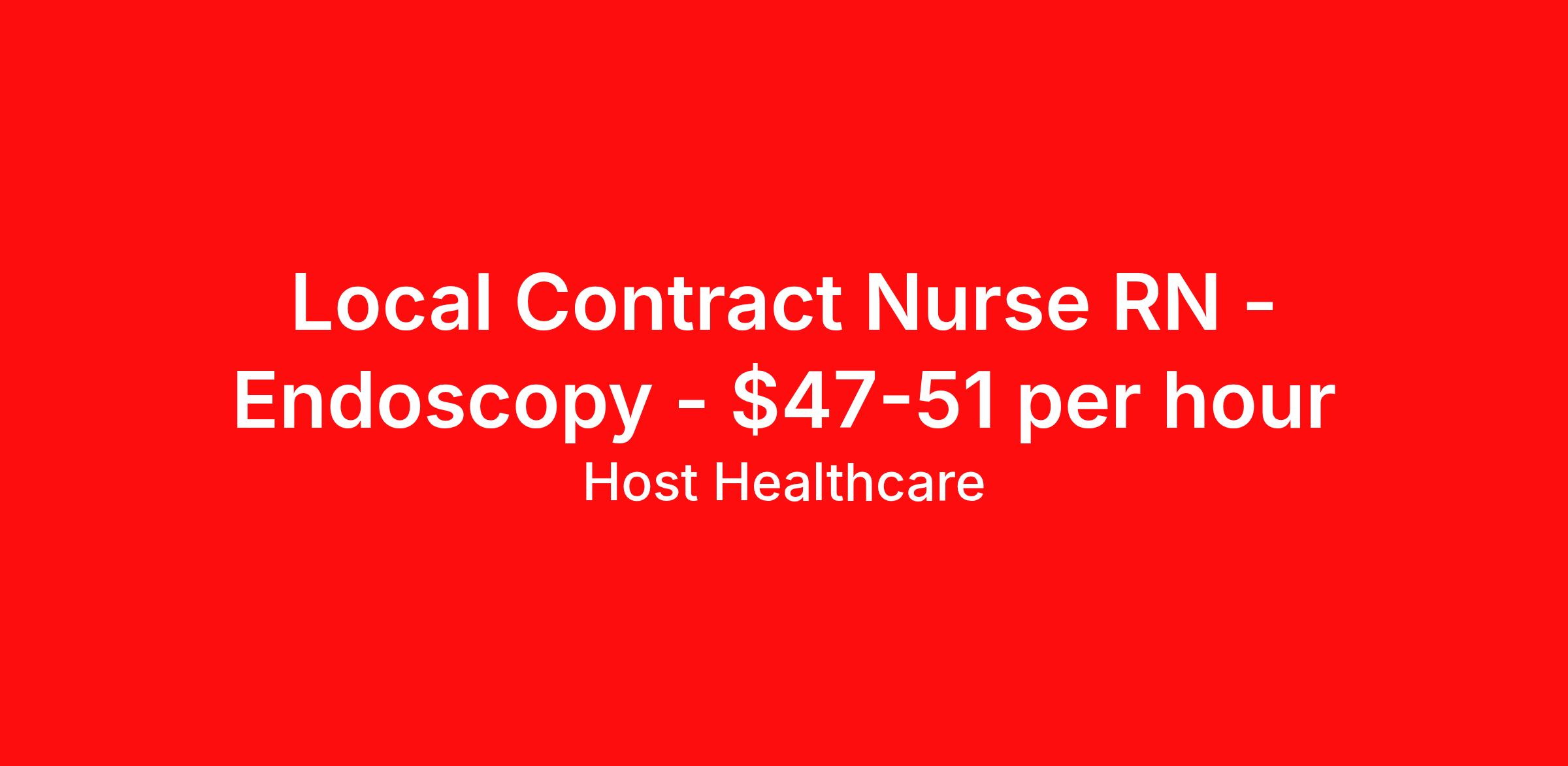 Host Healthcare is seeking a local contract nurse RN Endoscopy for a local contract nursing job in Cincinnati, Ohio. Job Description & Requirements Specialty: Endoscopy Discipline: RN Start Date: 04/06/2026 Duration: 13 weeks 40 hours per week Shift: 8 hours, days Employment Type: Local Contract Host Healthcare Job ID La1fVX000002y8pZYAQ. Pay package is based on 8 hour shifts and 40 hours per week (subject to confirmation) with tax-free stipend amount to be determined. Posted job title: RN - Endoscopy About Host Healthcare At Host Healthcare, we provide a truly comfortable experience as you explore your travel nursing, therapy, or allied career. We make your travel healthcare journey easy by taking care of all the details, so you don’t have to. We are on a mission to help others live better and we do this by helping the healers of the world be as comfortable as possible. With access to tens of thousands of travel nursing, therapy, and allied jobs in all 50 states, our responsive and friendly recruiters find your dream position based on what’s important to you. During your assignment, get access to premium benefits, including Day 1 medical that continues up to 30 days between assignments, 401K matching, travel reimbursements, dedicated housing support, and more. We also offer 24/7 support from our team and access to our on-staff clinicians so you can feel comfortable and confident throughout your entire assignment. Travel comfortably with Host Healthcare. Benefits Referral bonus School loan reimbursement Vision benefits Wellness and fitness programs Company provided housing options License and certification reimbursement Life insurance Medical benefits Mileage reimbursement Pet insurance Discount program Employee assistance programs Guaranteed Hours Health savings account Holiday Pay 401k retirement plan Continuing Education Dental benefits
