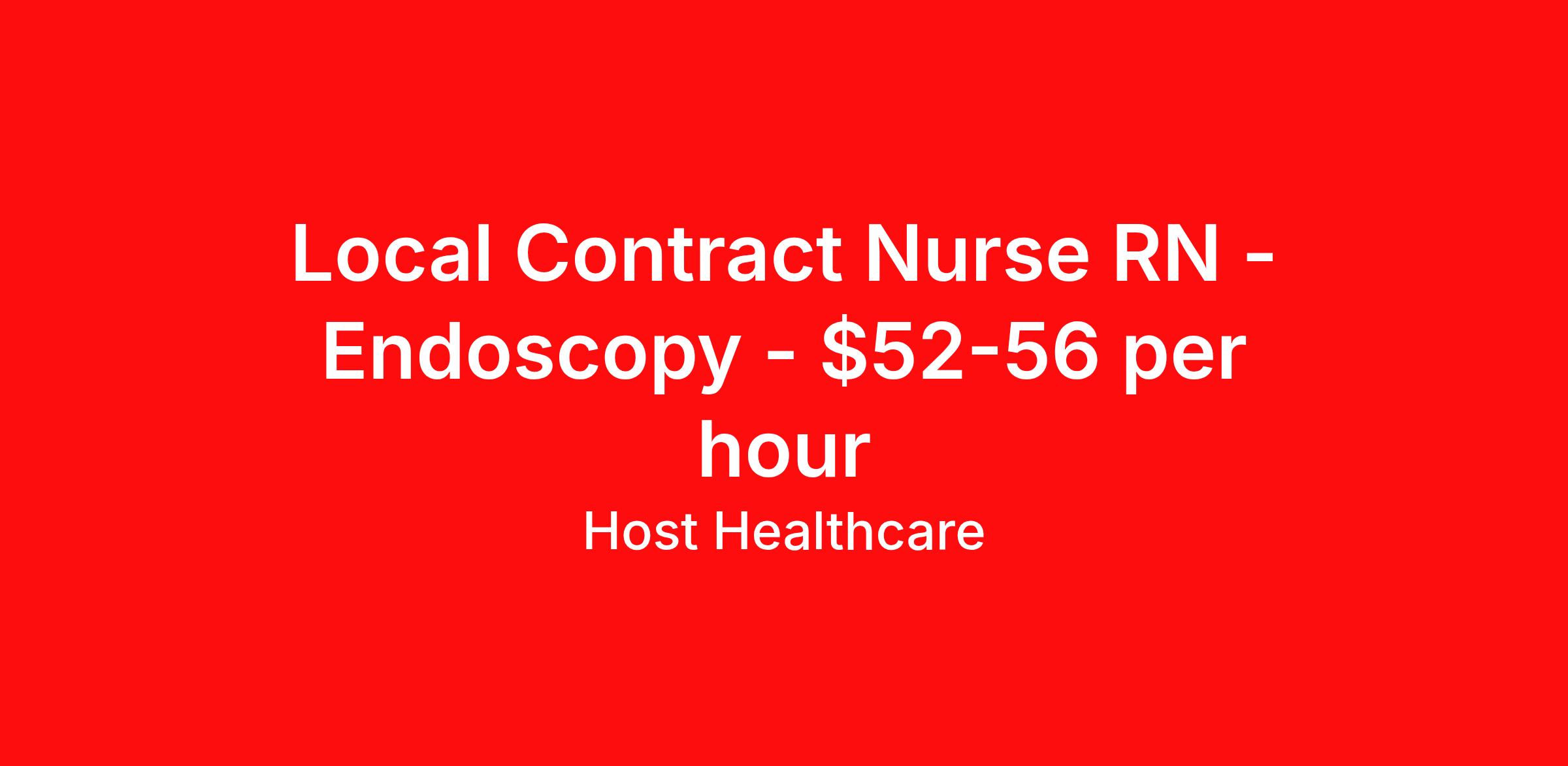 Host Healthcare is seeking a local contract nurse RN Endoscopy for a local contract nursing job in Boston, Massachusetts. Job Description & Requirements Specialty: Endoscopy Discipline: RN Start Date: 03/23/2026 Duration: 13 weeks 40 hours per week Shift: 10 hours, days, flexible Employment Type: Local Contract Host Healthcare Job ID La1fVX000002yHhZYAU. Pay package is based on 10 hour shifts and 40 hours per week (subject to confirmation) with tax-free stipend amount to be determined. Posted job title: RN - Endoscopy About Host Healthcare At Host Healthcare, we provide a truly comfortable experience as you explore your travel nursing, therapy, or allied career. We make your travel healthcare journey easy by taking care of all the details, so you don’t have to. We are on a mission to help others live better and we do this by helping the healers of the world be as comfortable as possible. With access to tens of thousands of travel nursing, therapy, and allied jobs in all 50 states, our responsive and friendly recruiters find your dream position based on what’s important to you. During your assignment, get access to premium benefits, including Day 1 medical that continues up to 30 days between assignments, 401K matching, travel reimbursements, dedicated housing support, and more. We also offer 24/7 support from our team and access to our on-staff clinicians so you can feel comfortable and confident throughout your entire assignment. Travel comfortably with Host Healthcare. Benefits Referral bonus School loan reimbursement Vision benefits Wellness and fitness programs Company provided housing options License and certification reimbursement Life insurance Medical benefits Mileage reimbursement Pet insurance Discount program Employee assistance programs Guaranteed Hours Health savings account Holiday Pay 401k retirement plan Continuing Education Dental benefits