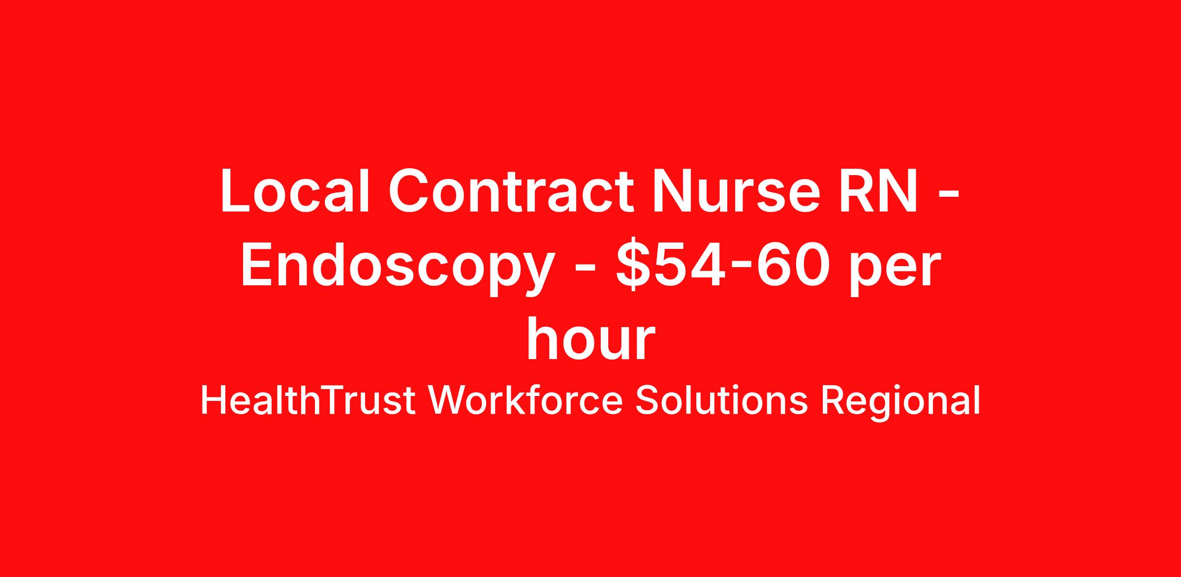 HealthTrust Workforce Solutions Regional is seeking a local contract nurse RN Endoscopy for a local contract nursing job in Richmond, Virginia. Job Description & Requirements Specialty: Endoscopy Discipline: RN Start Date: 04/13/2026 Duration: 13 weeks 36 hours per week Shift: 12 hours, days Employment Type: Local Contract RN ENDO (733) 7:30AM-5:00PM (981628) RN ENDOSCOPY (733) 10:00 AM- 6:30 PM (979332) RN ENDOSCOPY (733) 6:30 AM- 7:00 PM (979329)