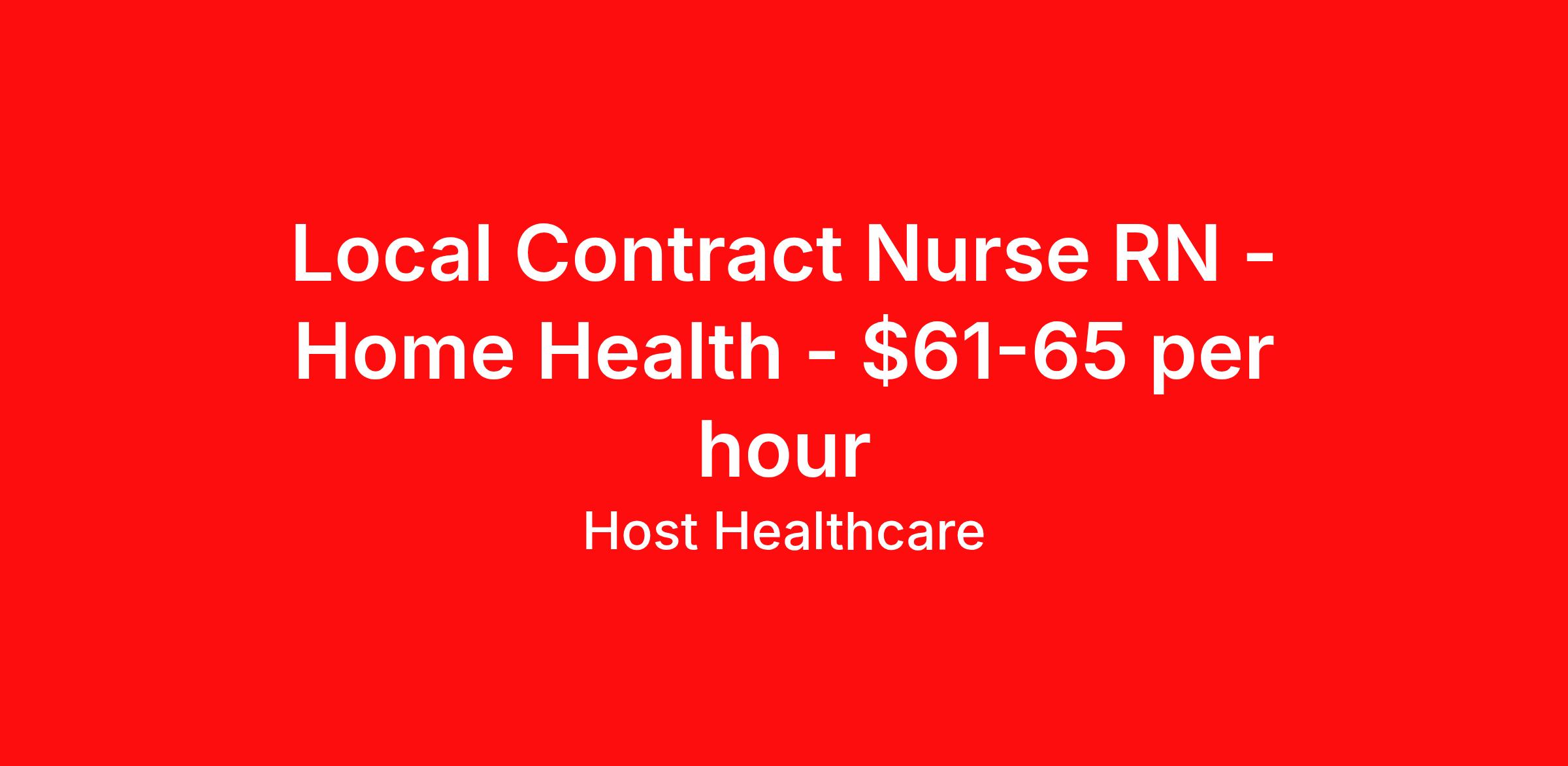 Host Healthcare is seeking a local contract nurse RN Home Health for a local contract nursing job in Anchorage, Alaska. Job Description & Requirements Specialty: Home Health Discipline: RN Start Date: 05/04/2026 Duration: 13 weeks 40 hours per week Shift: 9 hours, days Employment Type: Local Contract Host Healthcare Job ID La1fVX000003CH1lYAG. Pay package is based on 9 hour shifts and 40 hours per week (subject to confirmation) with tax-free stipend amount to be determined. Posted job title: RN - Home Health About Host Healthcare At Host Healthcare, we provide a truly comfortable experience as you explore your travel nursing, therapy, or allied career. We make your travel healthcare journey easy by taking care of all the details, so you don’t have to. We are on a mission to help others live better and we do this by helping the healers of the world be as comfortable as possible. With access to tens of thousands of travel nursing, therapy, and allied jobs in all 50 states, our responsive and friendly recruiters find your dream position based on what’s important to you. During your assignment, get access to premium benefits, including Day 1 medical that continues up to 30 days between assignments, 401K matching, travel reimbursements, dedicated housing support, and more. We also offer 24/7 support from our team and access to our on-staff clinicians so you can feel comfortable and confident throughout your entire assignment. Travel comfortably with Host Healthcare. Benefits Referral bonus School loan reimbursement Vision benefits Wellness and fitness programs Company provided housing options License and certification reimbursement Life insurance Medical benefits Mileage reimbursement Pet insurance Discount program Employee assistance programs Guaranteed Hours Health savings account Holiday Pay 401k retirement plan Continuing Education Dental benefits
