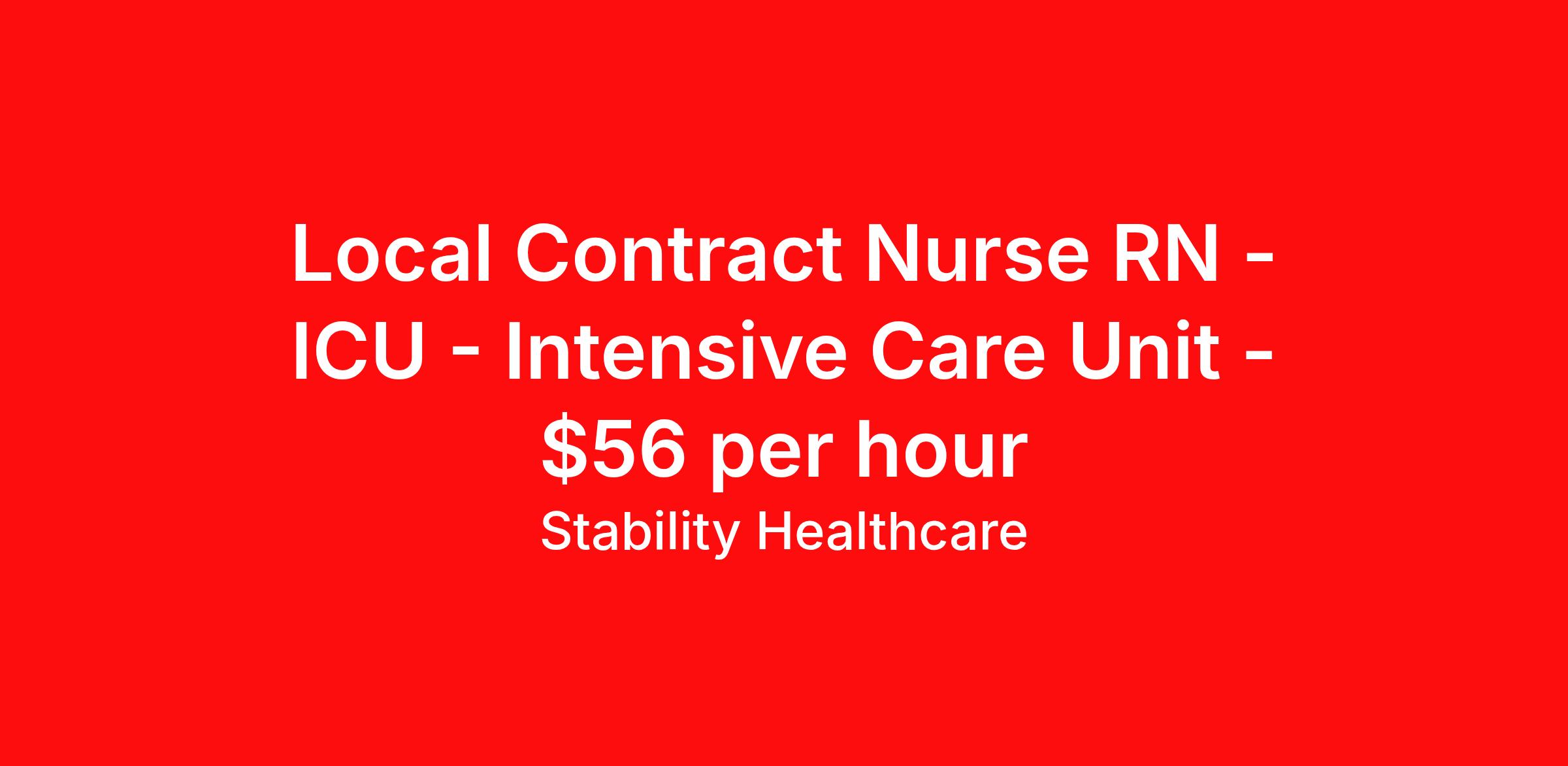 Stability Healthcare is seeking a local contract nurse RN ICU - Intensive Care Unit for a local contract nursing job in Woodruff, Wisconsin. Job Description & Requirements Specialty: ICU - Intensive Care Unit Discipline: RN Duration: 13 weeks 36 hours per week Shift: 12 hours, nights Employment Type: Local Contract Stability Healthcare is looking for a ICU RN contract position in Woodruff, WI. Intensive Care Unit (ICU) Nurses treat acutely ill patients with life-threatening conditions, in settings requiring continuous vigilance and high-intensity therapies. ICU nurses can specialize in a variety of disciplines including medical, surgical, cardiac, burn or Neuro ICU. *$600 travel bonus *Day 1 health insurance with United Healthcare *PTO plan start accruing on day 1, use during contract or cash out at the end! *Guaranteed stipend if facility calls you off *Extra hour bonus earn an additional hourly bonus for working over your weekly contracted hours Stability Job ID L-827165. Pay package is based on 12 hour shifts and 36 hours per week (subject to confirmation) with tax-free stipend amount to be determined. Posted job title: ICU About Stability Healthcare Stability Healthcare was founded in 2009, with the mission of becoming the best Travel Nursing Agency in California. We have been rated one of the top travel nursing agencies and offer our nurses the highest paying travel nursing jobs available. We have access to the best travel assignments from 1000’s of facilities. You can start the year off in sunny California, spend the Spring in the Colorado Rockies, enjoy the Summer in the Mid-West, experience the change of seasons in Boston and New York, and hit the beaches of Florida in the winter. Our Nurses work in the best hospitals and health systems in the country. Benefits Guaranteed Hours Benefits start day 1