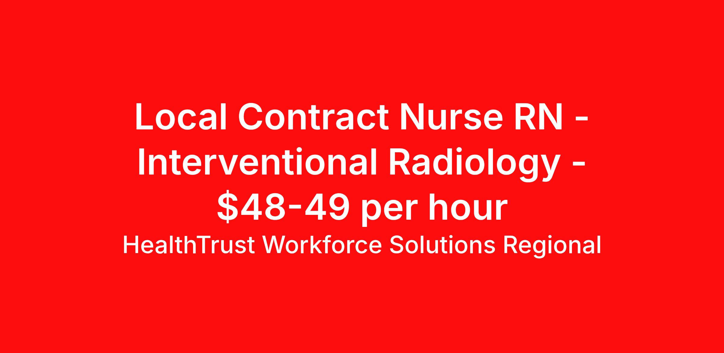 HealthTrust Workforce Solutions Regional is seeking a local contract nurse RN Interventional Radiology for a local contract nursing job in Denver, Colorado. Job Description & Requirements Specialty: Interventional Radiology Discipline: RN Duration: 13 weeks 40 hours per week Shift: 10 hours, days Employment Type: Local Contract We staff exclusively for all the HCA HealthONE facilities in the Denver-metro area. We currently have orders from Rose Medical and Presbyterian St. Luke's Medical. We also staff travel contracts and per diem positions, if you'd like to contact me about that please express your interest through Vivian so we can chat! Must Haves: - An ASN degree minimum, BSN preferred - A recent 12 months of IR RN experience in an acute inpatient hospital setting - Medical Imaging Experience - CO RN License - BLS, ACLS, and PALS Certifications Preferred or Nice to Have: - MediTech Experience - Travel Experience