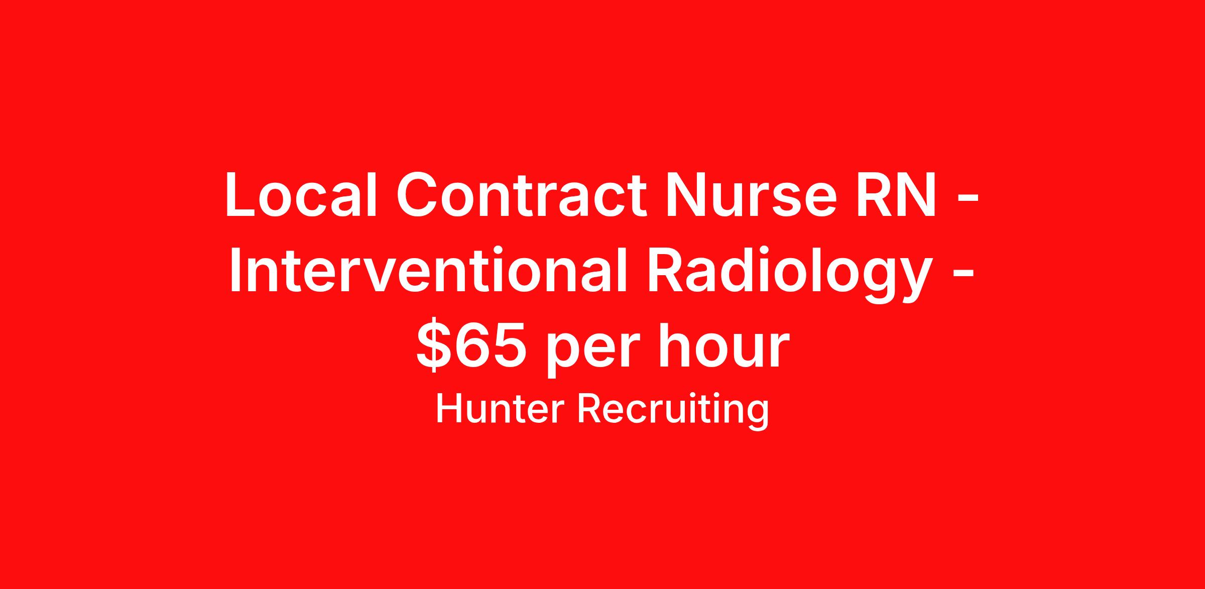 Hunter Recruiting is seeking a local contract nurse RN Interventional Radiology for a local contract nursing job in Cleveland, Ohio. Job Description & Requirements Specialty: Interventional Radiology Discipline: RN Start Date: 04/20/2026 Duration: 13 weeks 40 hours per week Shift: 10 hours, days Employment Type: Local Contract Interventional Radiology RN | Cleveland, OH | Days Unit: Department has two body IR, two neuro IR, one CT and one US interventional room. As well as a 12 bed Pre/Post area. With a 3:1 ratio. During your 40 hour week you will float among the pre/post area as well as procedures *On-Call requirement of 2 weekends(Sat-sun) and one week night per month. 2 years of recent Interventional Radiology experience required OH or Compact license required BLS and ACLS required Interventional Radiology RN | Cleveland, OH | Days Unit: Department has two body IR, two neuro IR, one CT and one US interventional room. As well as a 12 bed Pre/Post area. With a 3:1 ratio. During your 40 hour week you will float among the pre/post area as well as procedures *On-Call requirement of 2 weekends(Sat-sun) and one week night per month. 2 years of recent Interventional Radiology experience required OH or Compact license required BLS and ACLS required About Hunter Recruiting Founded in 2006, Hunter Recruiting is a national technical staffing leader. Hunter helps qualified job seekers find employers throughout the United States. Hunter Recruiting provides job placement for professionals in technical fields and executive positions with Fortune 1000 employers. Benefits Medical benefits Dental benefits Vision benefits