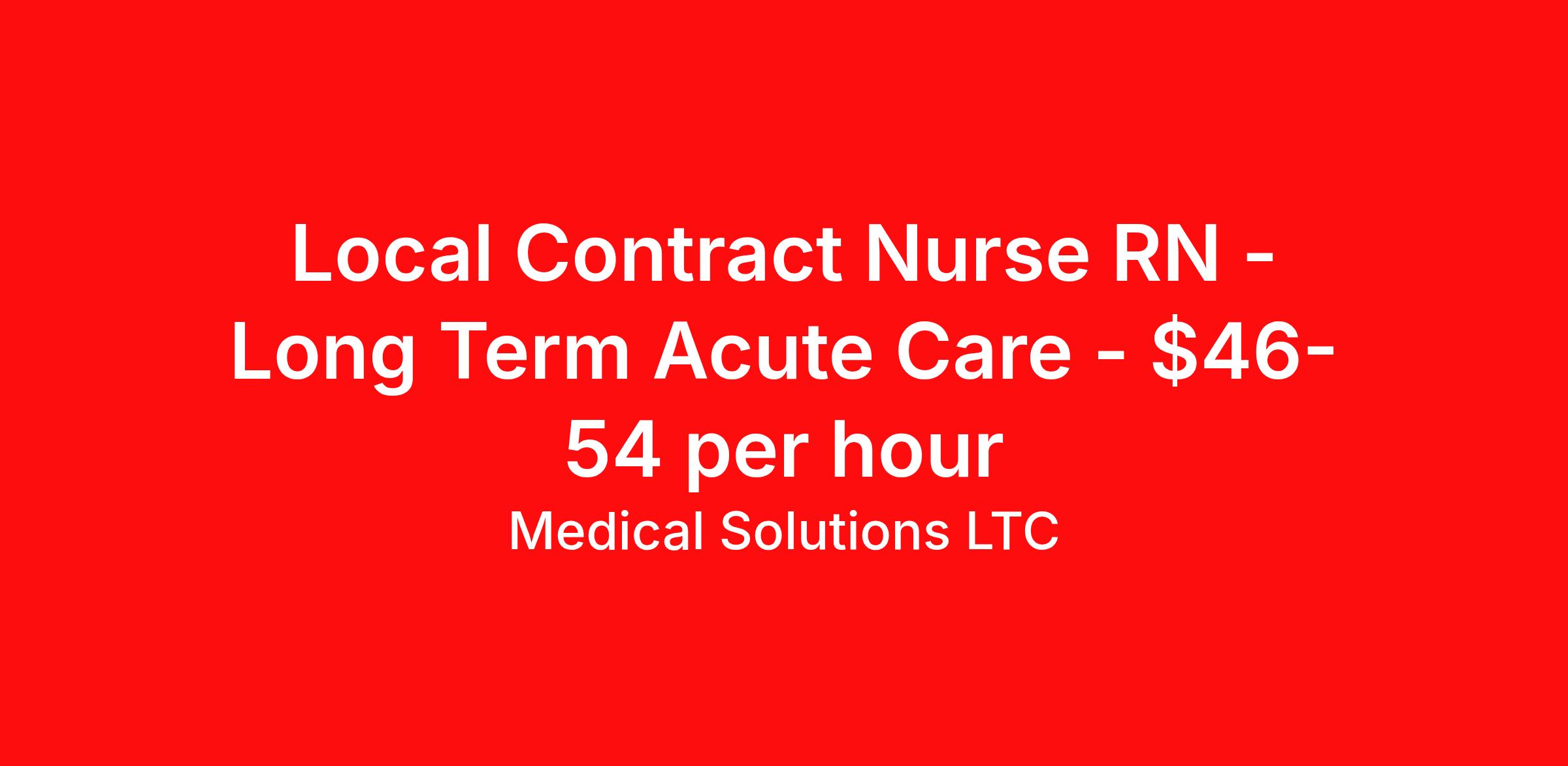 Medical Solutions LTC is seeking a local contract nurse RN Long Term Acute Care for a local contract nursing job in Des Moines, Iowa. Job Description & Requirements Specialty: Long Term Acute Care Discipline: RN Duration: 13 weeks 36 hours per week Shift: 12 hours, days Employment Type: Local Contract We’re seeking talented healthcare professionals whose adventure game is as strong as their clinical game. Those that want flexibility and high pay, we have the positions for you! Some of the industry-leading benefits enjoyed by Medical Solutions travel nurses and travel allied healthcare professionals include: Day One Medical, Dental, and Vision with low premiums Day One 401(k) with Company Contribution Personalized Compensation Packages Paid, Private, Fully Furnished, Pet-Friendly Housing Dedicated Recruiter and 24/7 Customer Care Line Per Diem Allowance and Paid Travel Licensure and Certification Reimbursement Free Liability Coverage Voluntary Benefits: Critical Illness, Hospital Indemnity, Accident, and Pet Insurance Equal Employment Opportunity And More! Estimated pay package based on bill rate at time job was posted. Bill rates can change frequently and without notice. Exact pay package may vary based on guaranteed hours, distance being traveled, and customizations available for travelers. Medical Solutions LTC Job ID 1067772L. Posted job title: LTAC (Long Term Acute Care) About Medical Solutions LTC At Medical Solutions, we’re people who care, helping people who care. No matter how you look at it, there’s a whole lot of care going on in our world and that’s just the way we like it. What do we do? Medical Solutions is one of the nation’s largest providers of total workforce solutions in the healthcare industry, connecting nurses and allied health clinicians with hospitals and healthcare systems across the country and around the corner. Through our family of brands, we also serve a segment of clients outside of the healthcare space. And we’re the very best at what we do. You’ll love our culture that’s filled with heart and soul. As a company and employer, we’re sincerely and unabashedly us. We lead as humans first and believe the unique qualities of each team member make us better together. We share a purpose for helping others and the drive to make a difference. And we offer endless opportunities for personal and professional growth, throughout your career. At Medical Solutions, you’ll find a great place to work and a career home. We’ve received Best Places to Work awards, landed top industry awards, and received accolades for the impact we’ve made in business and within our community. But the only way to really get to know us, is to join us. We think you’ll fit right in. Benefits Medical benefits Wellness and fitness programs Employee assistance programs Cancelation protection Discount program Mileage reimbursement Life insurance Vision benefits Referral bonus Pet insurance Continuing Education Holiday Pay License and certification reimbursement Guaranteed Hours Benefits start day 1 Company provided housing options 401k retirement plan Weekly pay Dental benefits