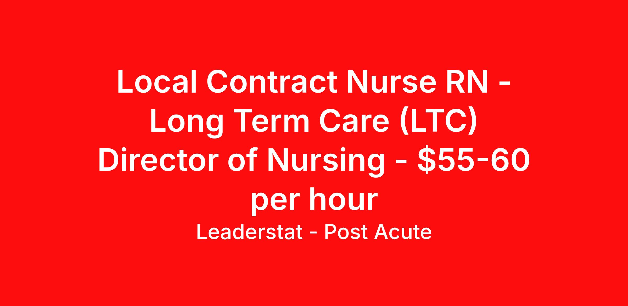 Leaderstat - Post Acute is seeking a local contract nurse RN Long Term Care (LTC) Director of Nursing for a local contract nursing job in Wayland, Michigan. Job Description & Requirements Specialty: Director of Nursing Discipline: RN Duration: 5 weeks 40 hours per week Shift: 8 hours, days Employment Type: Local Contract Census/Bed Size: 116 beds Shift/Schedule: m-f Priorities: Strong DON - They do have all key roles filled but use agency to staff floor staff Travel: Local only On call: yes