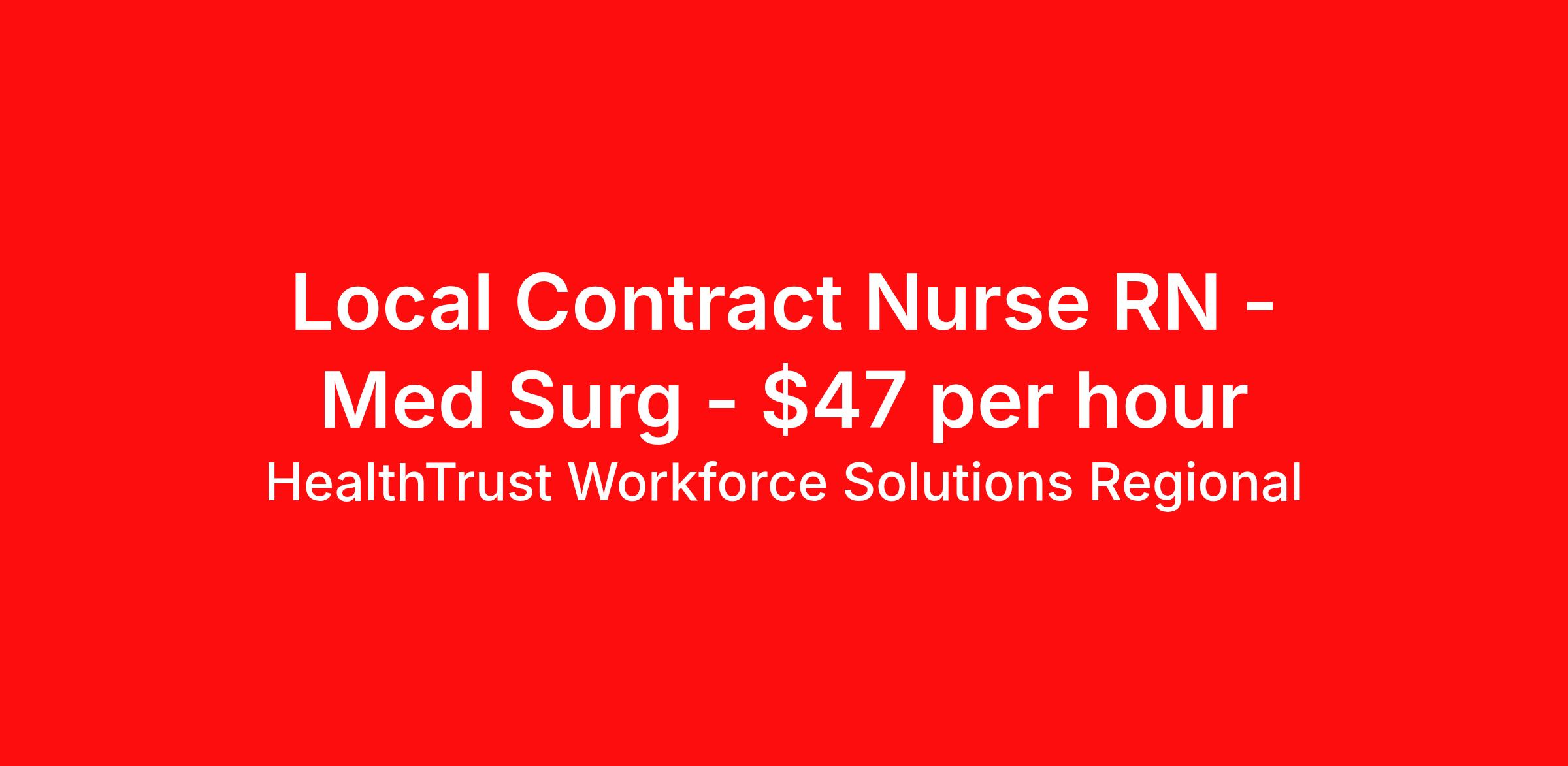 HealthTrust Workforce Solutions Regional is seeking a local contract nurse RN Med Surg for a local contract nursing job in Dallas, Texas. Job Description & Requirements Specialty: Med Surg Discipline: RN Duration: 13 weeks 36 hours per week Shift: 12 hours, nights Employment Type: Local Contract Entrust Your Career to HealthTrust Join one of the leading hospital organizations! Our partnering facility is seeking a highly-skilled caregiver to join their care team. The successful candidate is expected to be experienced in their area of specialty and offer a wide variety of high-level skills such as critical thinking and time management. For our local contract assignments, HealthTrust offers: Base pay (with potential weekend and night differentials if applicable to your specialty/geographic area) Guaranteed hours Weekly direct deposit 401k Quarterly bonus options for 468 hours worked Earn up to $1000 for referrals HWS GO mobile app for visibility to per diem and other open contract roles About HealthTrust Workforce Solutions: HealthTrust is a preferred partner to thousands of top-performing hospitals, we provide our healthcare professionals with first-priority access to more than 200,000 jobs nationwide. Apply Today! Not for You? Reach out to learn more about our Refer a Friend opportunity and Earn up to $1000. Have Questions? Live Chat with a Recruiter: You can also set up a calendar event to speak at a time that works for you: calendly.com/interviewcleeveshealthtrust We are an equal opportunity employer and value diversity at our company. We do not discriminate on the basis of race, religion, color, national origin, gender, sexual orientation, age, marital status, veteran status, or disability status.