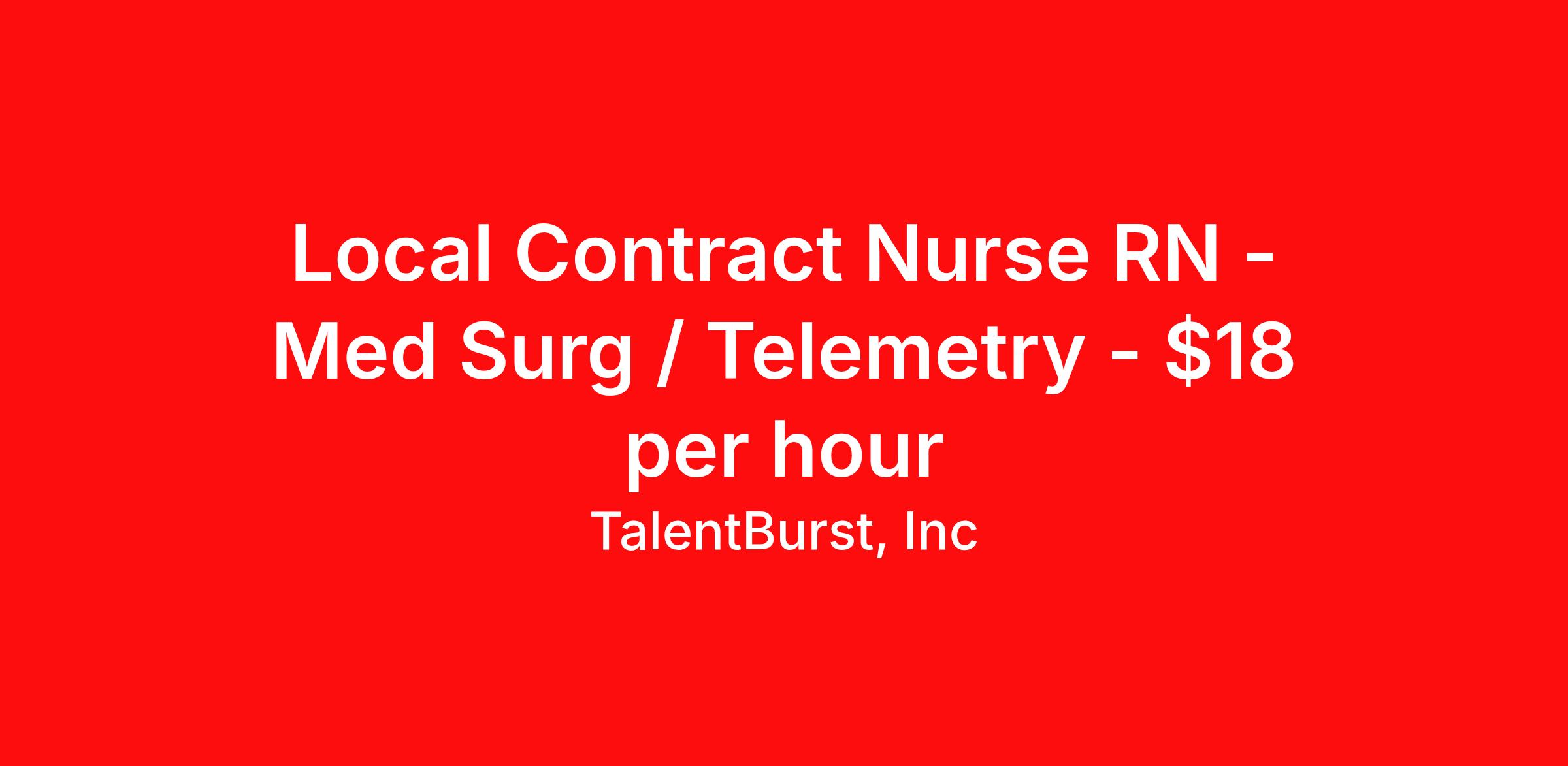 TalentBurst, Inc is seeking a local contract nurse RN Med Surg / Telemetry for a local contract nursing job in Winston-Salem, North Carolina. Job Description & Requirements Specialty: Med Surg / Telemetry Discipline: RN Start Date: 03/23/2026 Duration: 12 weeks 36 hours per week Shift: 12 hours Employment Type: Local Contract JOB DESCRIPTION RN - MedSurg/Tele ● About Facility: 1 Medical Center Blvd. Winston-Salem, NC 27103 885 licensed beds Level 1 Trauma Designation Teaching Hospital: Yes, Academic Medical Center Chest Pain Center Stroke Center ● Unit Information: Beds: 20 beds total, 10 in 5A and 10 in 5B Minimum Years of Experience required? 2 years of MedSurg experience Will you accept a first-time traveler? No ● Patient Types/Common Diagnoses: Transitional Care Unit General MedSurg: CHF, COPD, kidney/liver/GI/respiratory issues, CIWA patients, infections, wounds, etc. Mostly medical patients seen on this unit, but any service line can admit, so could see some general surgeries and other patients ● Patient Ratios: 1:5 ● Required License, National Certification, Certs: BLS, ACLS ● Skills required: Trachs, chest tubes, IV starts, wound care, dressing changes, wound vacs, drains, cardiac rhythm interpretation (will check off on strips during shift), central line blood draws Non-titrating Drips (required): Heparin, Lasix, Protonix Non-titrating Drips (preferred): Cardizem, Amiodarone (please note in offer if they have this experience. Can teach here if no experience) ● Support within the Department: 1 CNA for 5A, 1 CNA for 5B 1 Charge to cover both areas, could take patients if needed Receptionist/HUC? No Phlebotomy 24/7 – RNs could collect labs as well RT 24/7 Hospitalist 24/7 Residents 24/7 Telemetry monitoring/tech? Bedside monitors w/ central monitor at nurses' station ● Technology/Equipment: EMR: EPIC IV Pump: Alaris Med dispensing: Omnicell ● Floating: Could float within scope of practice at hospital ● Orientation (facility and unit): NEO 2 shifts on unit to orient ● Scheduling: Weekend rotation: Every other On call? No Holiday Expectations: 50% of holidays in contract Approval of RTO: ok to approve up to 7 days Shift times: 1830-0700 Schedule cycle: Scheduler will make schedule 6-week increments. Travelers will be plugged into holes in the schedule Do not allow traveler overtime unless approved through upper leadership (not common) ● Other notes: Scrub Color: Royal Blue Parking: Free TB_RN ZRHC Talent Burst Job ID 26-05199. Posted job title: Registered Nurse - MedSurg/Tele About TalentBurst, Inc TalentBurst Health & Life Sciences is an established provider of healthcare workforce solutions, servicing healthcare facilities across the United States for over 15 years. As a Joint Commission Certified Agency, our commitment to quality, integrity, and exceptional service has made us a trusted name in the healthcare staffing landscape. Our mission is to bridge the gap between healthcare professionals seeking fulfilling opportunities and healthcare organizations striving to maintain their high standards of care. We are committed to providing top-notch healthcare professionals with access to facilities where they can focus on delivering exceptional patient care and thrive. Whether you're a nurse, allied health professional, or administrative personnel, we have the expertise to match your skills and aspirations with the perfect placement.