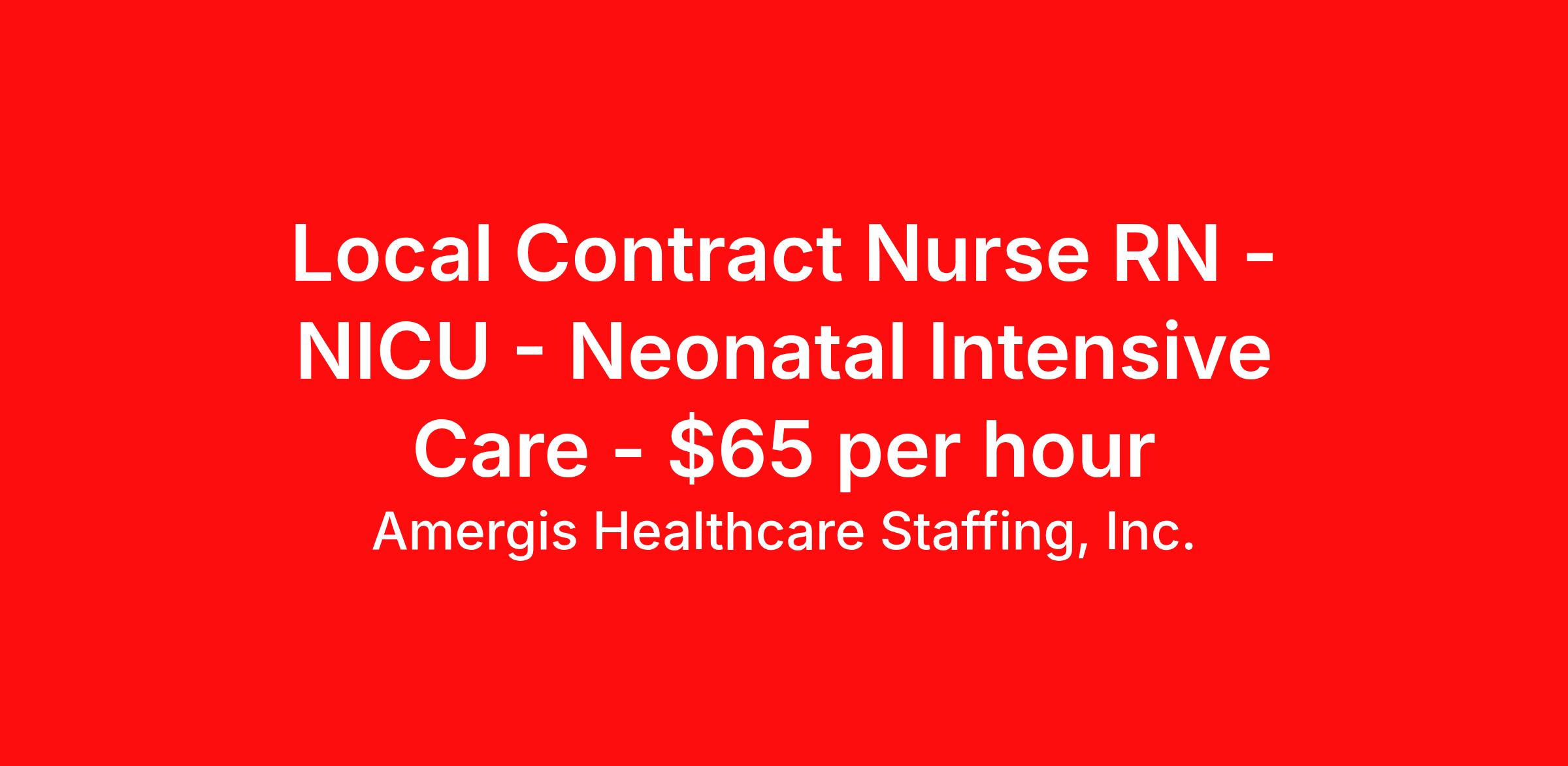 Amergis Healthcare Staffing, Inc. is seeking a local contract nurse RN NICU - Neonatal Intensive Care for a local contract nursing job in Chicago, Illinois. Job Description & Requirements Specialty: NICU - Neonatal Intensive Care Discipline: RN Start Date: 04/14/2026 Duration: 13 weeks 36 hours per week Shift: 12 hours, nights Employment Type: Local Contract About Amergis Healthcare Staffing, Inc. Amergis, formerly known as Maxim Healthcare Staffing, has served our clients and communities by connecting people to the work that matters since 1988. We provide meaningful opportunities to our extensive network of healthcare and school-based professionals, ready to work in any hospital, government facility, or school. Through partnership and innovation, Amergis creates unmatched staffing experiences to deliver the best workforce solutions.