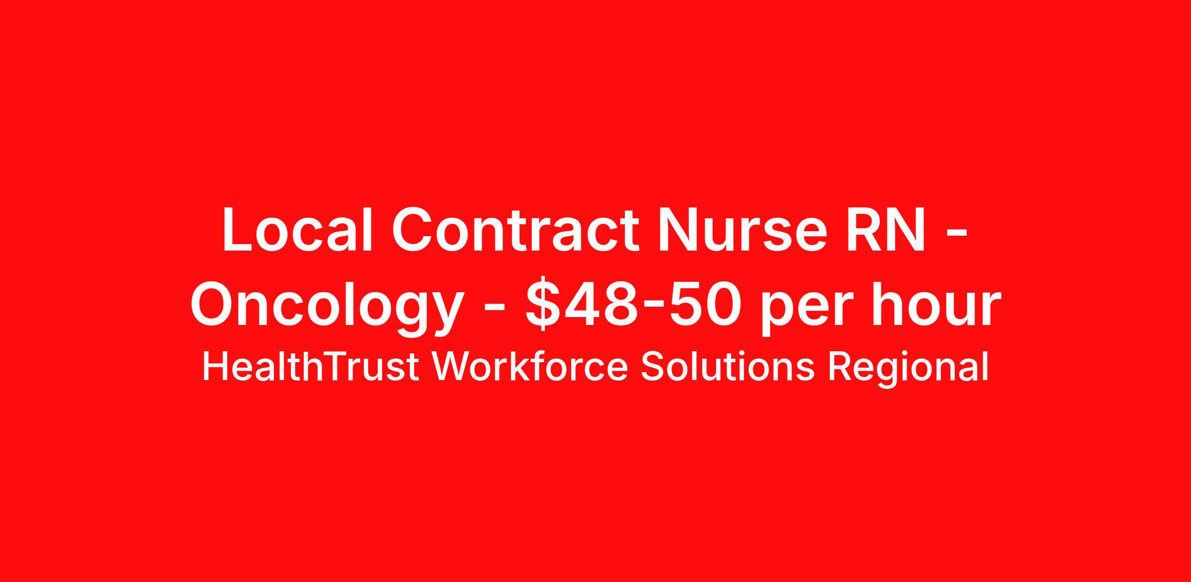 HealthTrust Workforce Solutions Regional is seeking a local contract nurse RN Oncology for a local contract nursing job in Richmond, Virginia. Job Description & Requirements Specialty: Oncology Discipline: RN Duration: 13 weeks 36 hours per week Shift: 12 hours, days, nights Employment Type: Local Contract Unit Specifics: · Number of Beds : 24 · Documentation system: Meditech · Floating policy: as needed · Patient Experience requirements: Whiteboards, Bedside Shift Report, Hourly Safety Rounds, Key Words Travel contracts, resource pool, and per diem available as well.