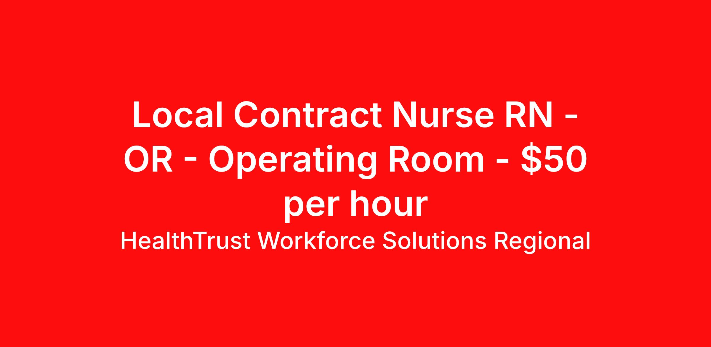 HealthTrust Workforce Solutions Regional is seeking a local contract nurse RN OR - Operating Room for a local contract nursing job in Salem, Virginia. Job Description & Requirements Specialty: OR - Operating Room Discipline: RN Duration: 13 weeks 40 hours per week Shift: 10 hours, days Employment Type: Local Contract Unit Specifics: · Number of Beds :11 -OR rooms · Type of equipment :Hanah Tables, Jackson tables, vascular beds, Cysto beds, Robot beds · Documentation system:Meditech Hospital Specifics- · Certifications:BLS Requested Skill Set:Must have 2 years experience. Experience in a level ll or higher. Must be proficient in Ortho trauma, Crani’s, Burr holes, Robotic general (Appy, Lap Chloe) Cystos, ENT, Total Joints Advanced skills needed: Proficient in DaVinci robots, Ortho trauma, Crani Procedures performed on unit: Cystoscopy, Lumbar Lami, Total Joints, Robotic general, Robotic GYN, Ent, Minimal Plastic surgeries, Breast surgeries Certifications Required :BLS Travel contracts, per diem, and resource pool available as well.