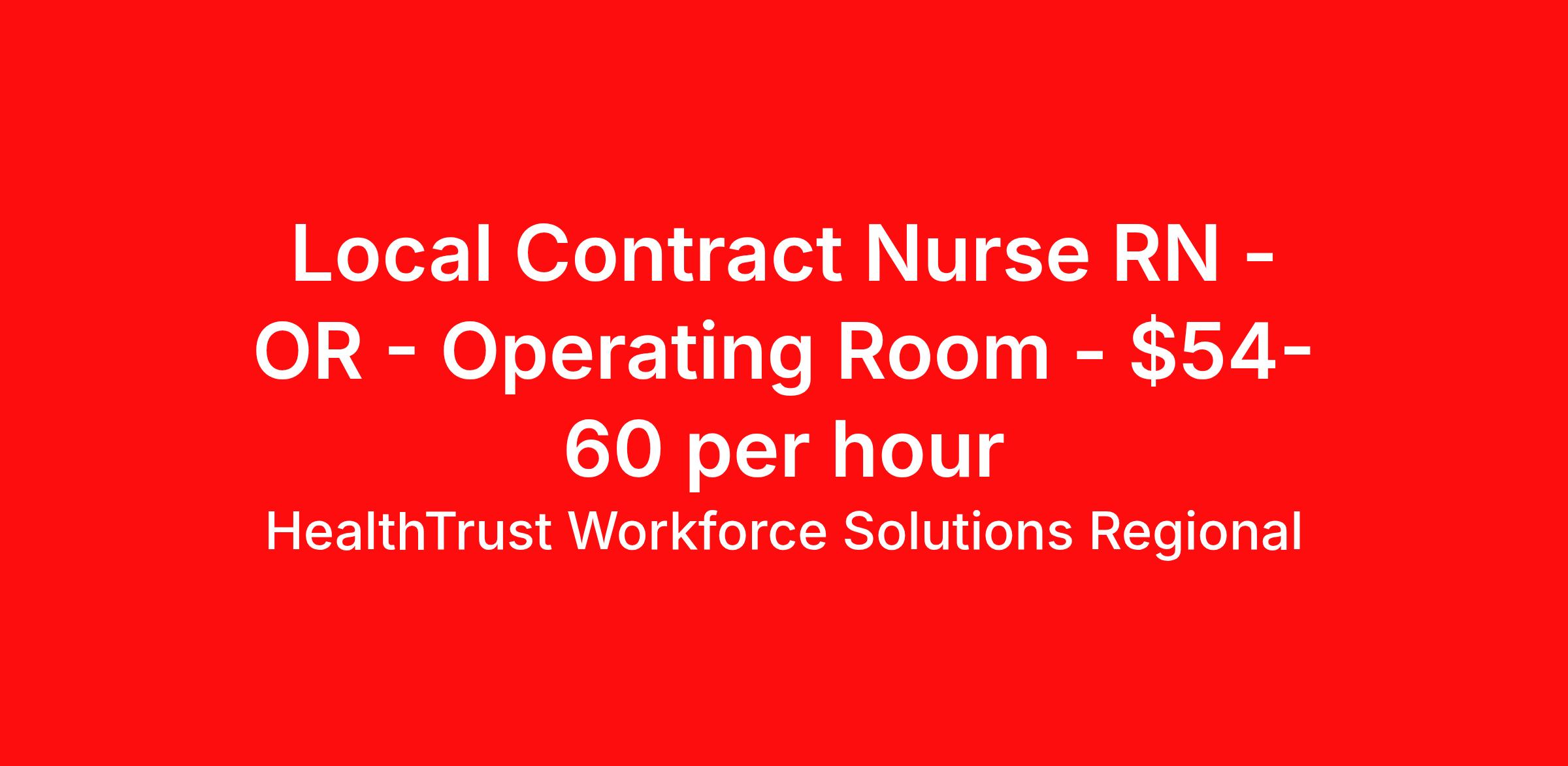HealthTrust Workforce Solutions Regional is seeking a local contract nurse RN OR - Operating Room for a local contract nursing job in Myrtle Beach, South Carolina. Job Description & Requirements Specialty: OR - Operating Room Discipline: RN Start Date: ASAP Duration: 13 weeks 36 hours per week Shift: 12 hours, days Employment Type: Local Contract