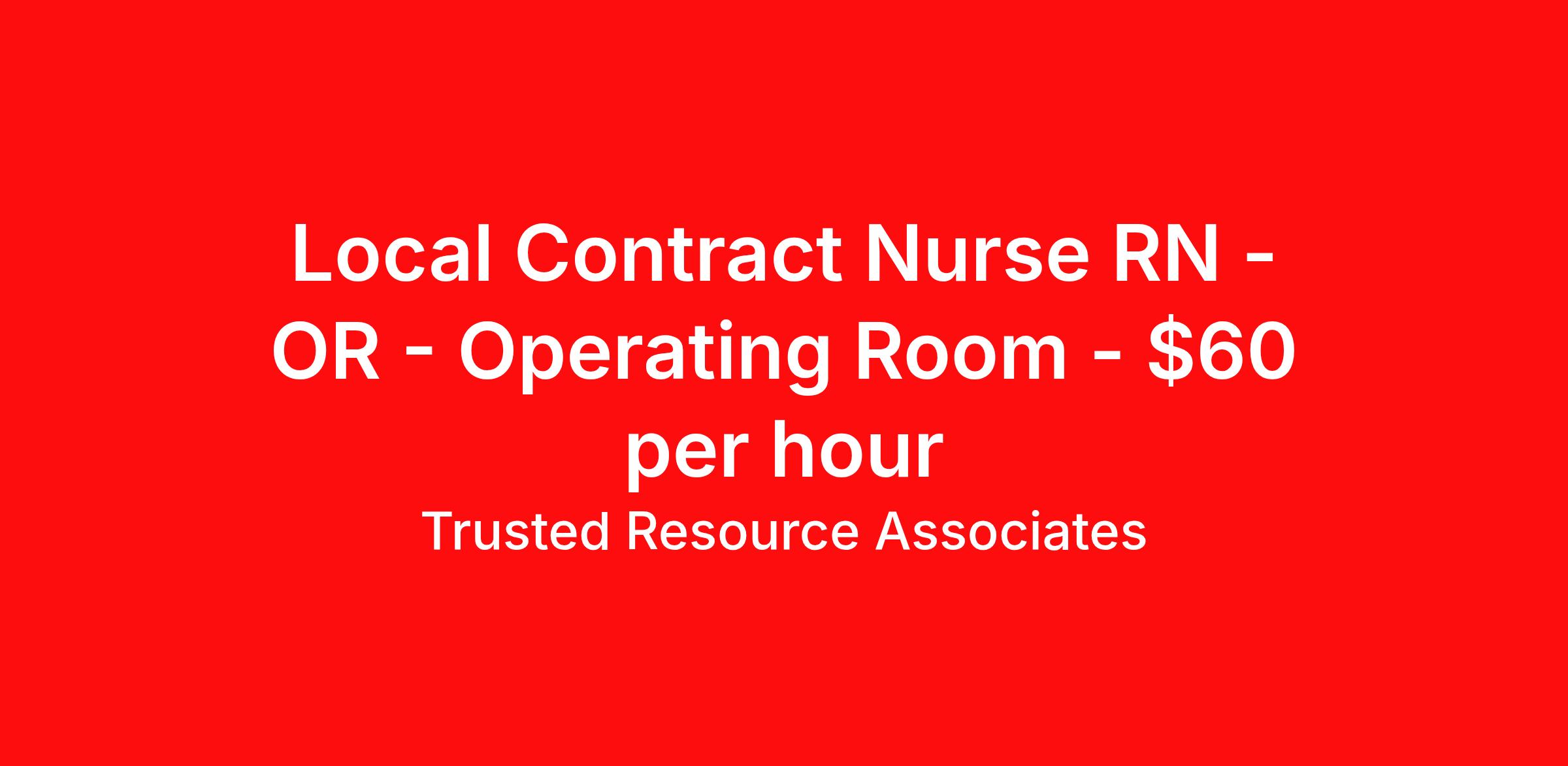 Trusted Resource Associates (TRA) is seeking a local contract nurse RN OR - Operating Room for a local contract nursing job in West Palm Beach, Florida. Job Description & Requirements Specialty: OR - Operating Room Discipline: RN Start Date: 04/01/2026 Duration: 13 weeks 36 hours per week Shift: 12 hours, days Employment Type: Local Contract TRA RN Operating Room TRA is Tenet's in-house nationwide contingent pool for Nursing and Allied travel and local contracts. Receive a greater level of Contract security compared to with an outside agency. BENEFITS - Guaranteed hours for Travel Contracts - Preferred Booking Agreement for Local Contracts - Weekly Pay - Holiday Pay - Contract Security compared to a contract with an outside agency Minimum education Graduate of an accredited School of nursing Minimum Experience Must have 2 years of Acute Care nursing experience with a minimum one year current in the OR Required Certification/Licensure - Must be currently licensed, certified or registered to practice profession as required by law, regulation in state of practice or policy. Must meet all certification requirements for each nursing specialty supported - American Heart Association - CPR-Basic Life Support - Other credentialing items, such as a skills checklist and health related documents, which will be specified by your Recruiter. Our Hire Process - We do qualify our clinicians to meet or exceed the minimum requirements of a travel or local assignment. If you are qualified, we may direct-hire you, reducing the time we can get you to work! When you reach out to a TRA Recruiter for more details, ensure your Vivian profile includes your most updated resume! Trusted Resource Associates (TRA) Job ID 500305. Benefits 401k retirement plan Weekly pay Holiday Pay Referral bonus