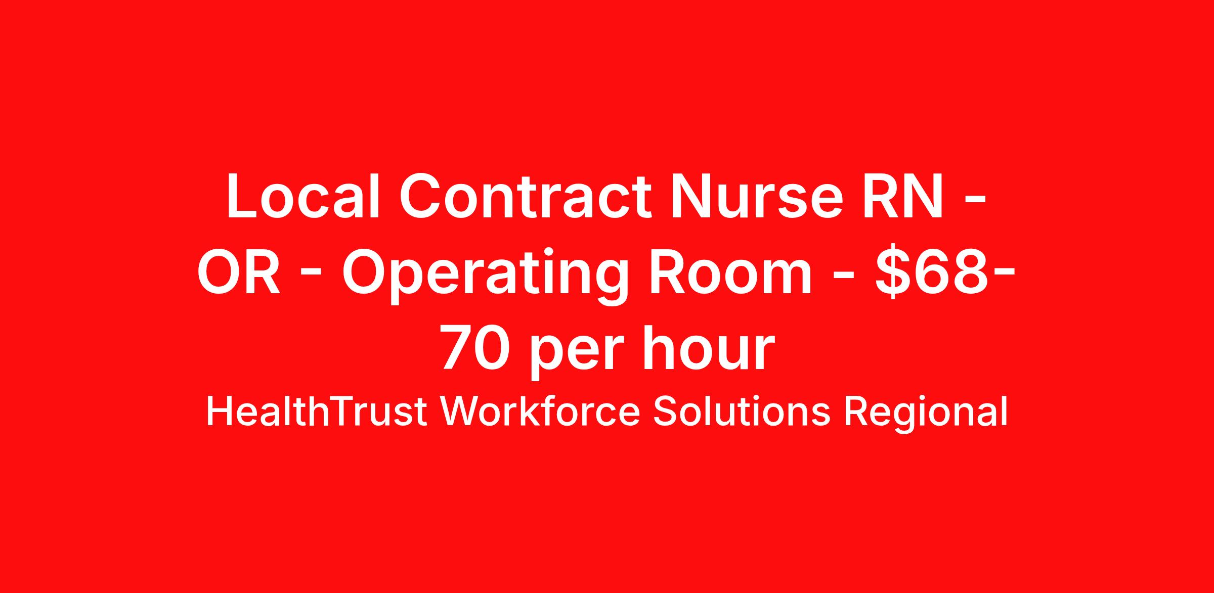 HealthTrust Workforce Solutions Regional is seeking a local contract nurse RN OR - Operating Room for a local contract nursing job in Caldwell, Idaho. Job Description & Requirements Specialty: OR - Operating Room Discipline: RN Duration: 13 weeks 36 hours per week Shift: 12 hours, days Employment Type: Local Contract Requested Skill Set: At least one-year previous RN circulating experience in relevant service lines such as ortho, spine, urology, and general surgery Advanced skills needed: Robotics - Davinci Procedures performed on unit: Ortho, neuro, spine, urology, general, GYN, bariatrics, podiatry, endoscopy. ECTs Certifications Required: BLS • 36 guaranteed hours a week and RTO upon request • Potential Overtime hours • 13 week contract, book directly with facility • Potential to extend contract with facility • Potential hourly incentives for specific specialties • 401k & Discounted stock purchase options