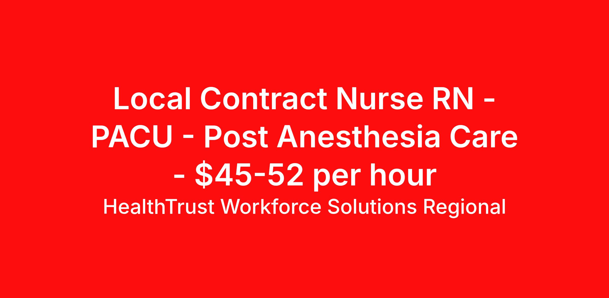 HealthTrust Workforce Solutions Regional is seeking a local contract nurse RN PACU - Post Anesthesia Care for a local contract nursing job in Chattanooga, Tennessee. Job Description & Requirements Specialty: PACU - Post Anesthesia Care Discipline: RN Duration: 13 weeks 13 hours per week Shift: 12 hours, days Employment Type: Local Contract HealthTrust Offers: - Premium pay with shift differentials - Local/Travel contracts include guaranteed hours - Increased rates with local contracts - Weekly direct deposit - Medical, dental, vision, PTO, Employee Stock Program, and more offered based on position - 401k with company match for all employees - Lucrative referral bonuses, up to $750 - RNs eligible for quarterly bonuses Requirements: - Minimum 1 year of acute care experience in a hospital setting - Current hospital experience is required for desired specialty - Valid state nursing license - Appropriate certifications as required by state and position - Degree from an accredited school of nursing