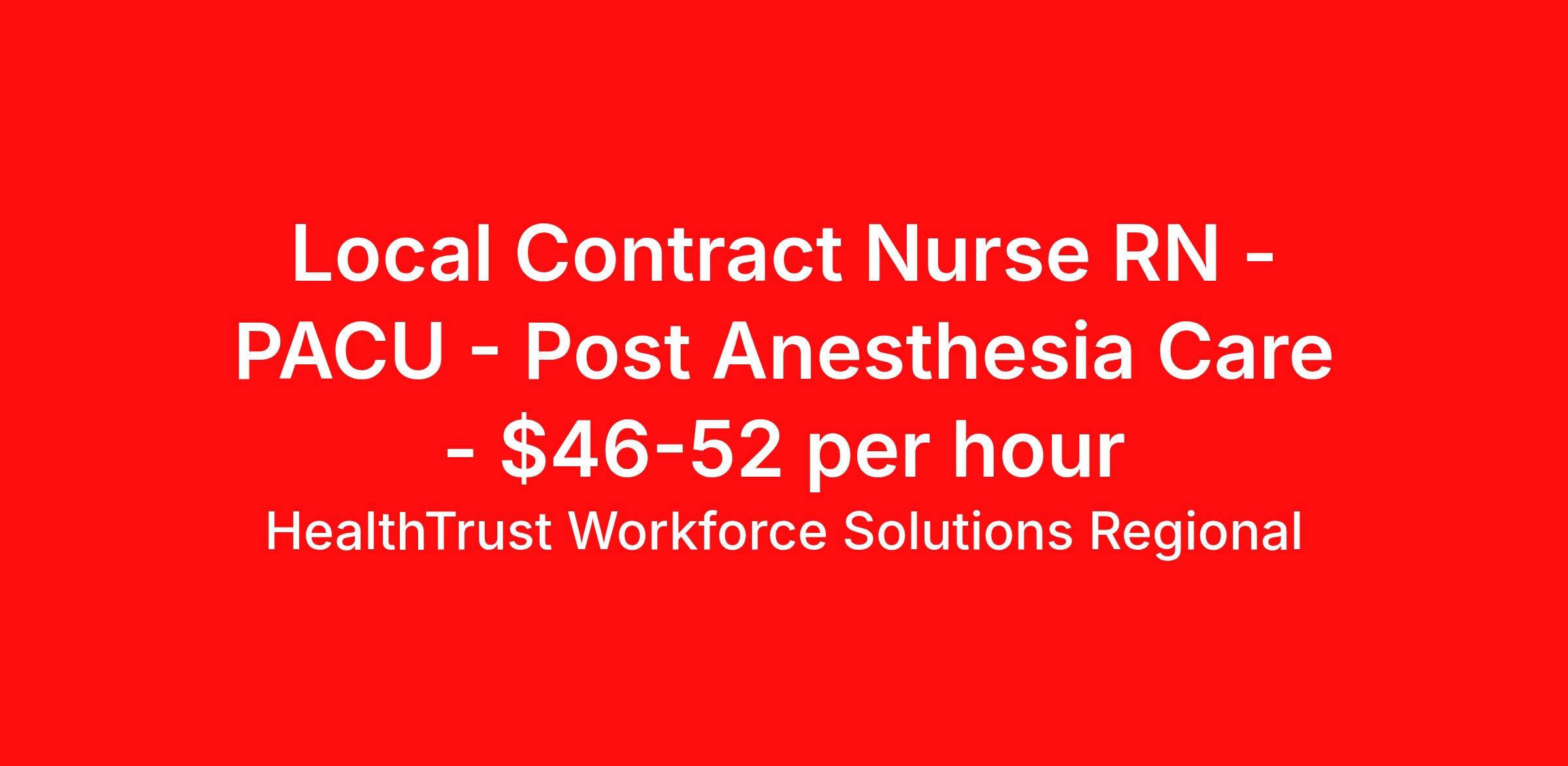 HealthTrust Workforce Solutions Regional is seeking a local contract nurse RN PACU - Post Anesthesia Care for a local contract nursing job in Salem, Virginia. Job Description & Requirements Specialty: PACU - Post Anesthesia Care Discipline: RN Duration: 10 weeks 36 hours per week Shift: 12 hours, days Employment Type: Local Contract Tell us about the unit(s): Number of Beds – 19 Ambulatory Surgery Type of equipment – Suction, Oxygen, Vein finder, Bladder Scanner, Glucose machine, clippers, Meditech- documentation in OR module EMR – EMAR Must have : candidates without these skills will not be considered for the role. BLS Pre op and Post op experience in Ambulatory Surgery Dept., Good IV stick Preferred or nice to have : candidates with these skills will be considered first. ACLS List typical procedures performed on unit: Pre op patients, prep patients for surgery, post op care Pre op care of and post op care of: Interventional patients, CT bx, Open heart patients- pre op, Total joint, Choley, Urology surgeries, children- teeth and tonsillectomy surgeries, spine surgery, hysterectomy, etc… Best personality Fit: Team player, able to multi-task, quick learner, self-starter, flexible with schedule, excellent bedside manner, REQUIRED CERTIFICATIONS: BLS required, ACLS and PALS preferred Floating Area(s): Possible to assist ENDO to pre op patients- start IV’s Resource pool, per diem, and travel assignments available as well.