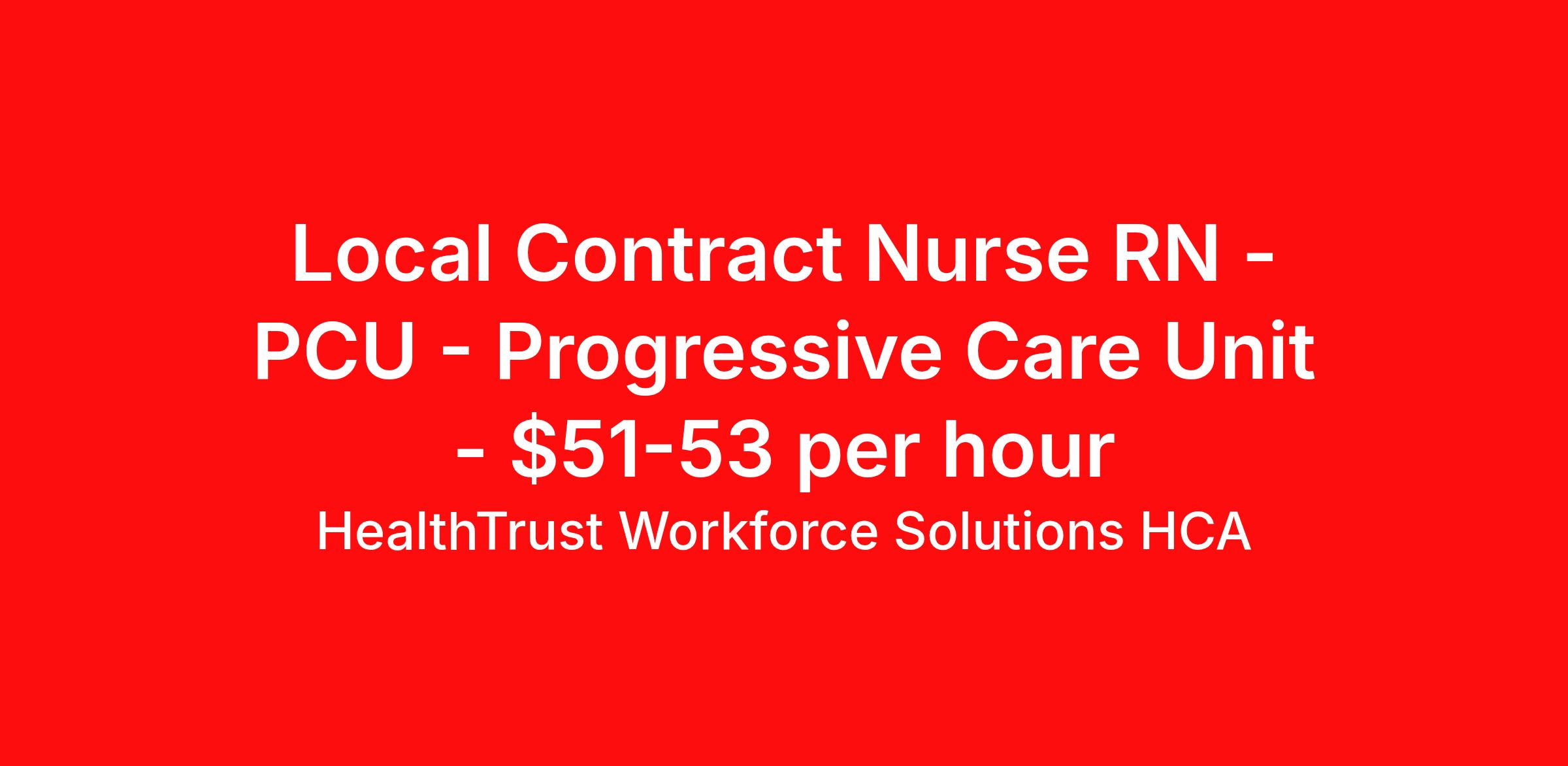 HealthTrust Workforce Solutions HCA is seeking a local contract nurse RN PCU - Progressive Care Unit for a local contract nursing job in Bowling Green, Kentucky. Job Description & Requirements Specialty: PCU - Progressive Care Unit Discipline: RN Duration: 13 weeks 36 hours per week Shift: 12 hours, nights Employment Type: Local Contract Referral Bonus Medical Benefits 7p-7a avail, 13 weeks, start asap 2 years recent acute care experience BLS, ACLS, NIH Please call or text if you are interested! About HealthTrust Workforce Solutions HCA At HealthTrust Workforce Solutions, healthcare is not just about the four walls of a facility but about the people who provide and receive care. Our focus is on empowering healthcare professionals to deliver exceptional patient experiences by providing them with the necessary skills, tools, and support. We partner with healthcare facilities nationwide to ensure that the right professionals are in the right roles. We prioritize our clinicians by giving them a voice and access to opportunities to fulfill their mission of improving lives by providing quality patient care. We are committed to our core values of Trust, Innovation, Adaptability, Courage, and Accountability. We are dedicated to positively impacting the healthcare industry by providing first-priority access to more than 200,000 jobs nationwide to our healthcare professionals. Join us and be part of the HealthTrust family, where you can make a difference every day. We embrace our changing environment, and we maintain a culture that has a rich tradition of transforming itself to meet the challenges of the future. MISSION STATEMENT While putting great people in the right roles is essential, our mission is far greater. We want our clinicians to be part of the HealthTrust family, where healthcare professionals have a voice and are empowered with the right tools and opportunities to fulfill their personal mission of improving lives. Plus, as a preferred partner to thousands of top-performing hospitals, we provide our healthcare professionals with first-priority access to more than 200,000 jobs nationwide. Benefits Dental benefits Vision benefits Referral bonus Continuing Education Life insurance