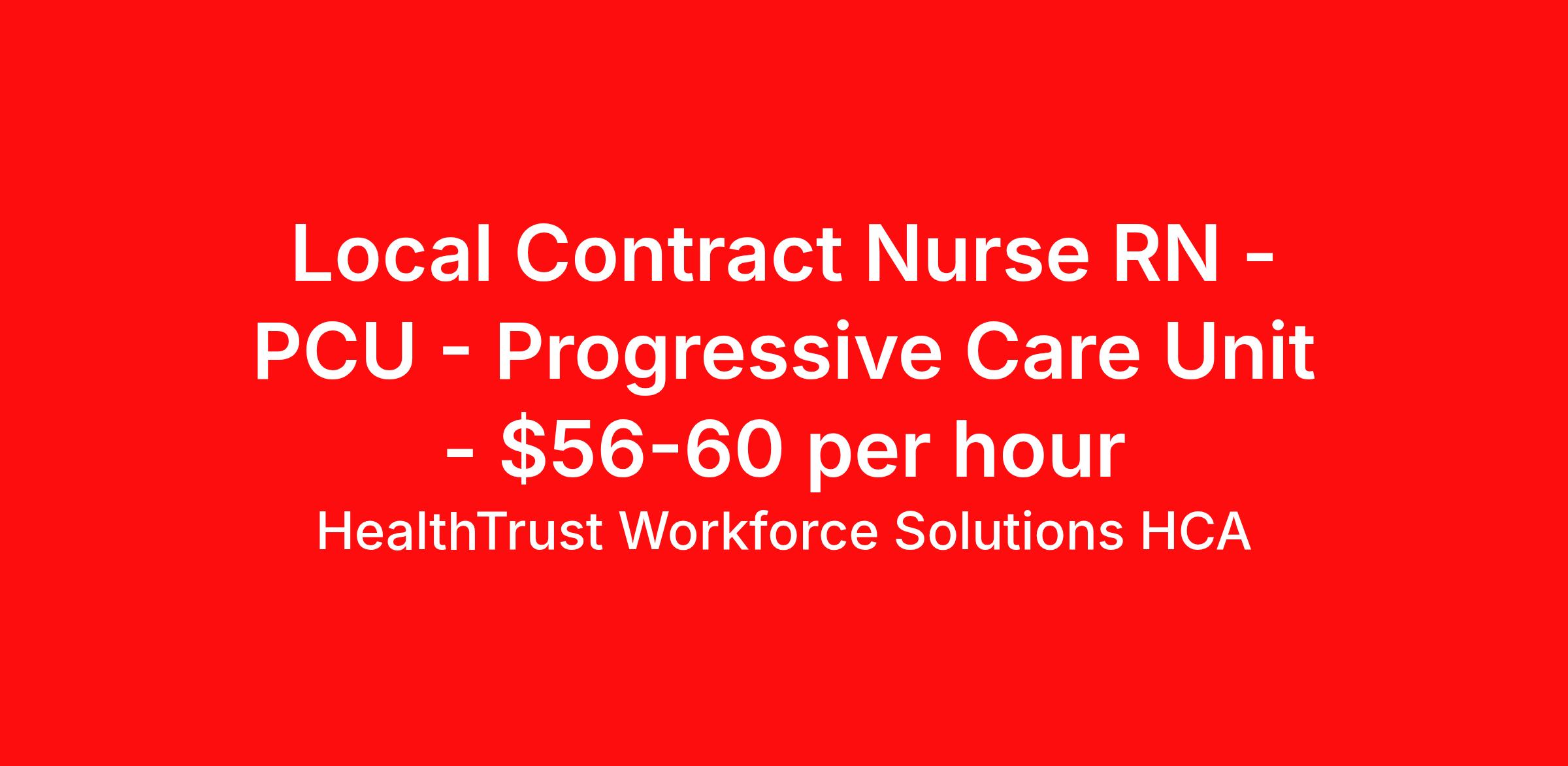 HealthTrust Workforce Solutions HCA is seeking a local contract nurse RN PCU - Progressive Care Unit for a local contract nursing job in Englewood, Colorado. Job Description & Requirements Specialty: PCU - Progressive Care Unit Discipline: RN Start Date: 03/30/2026 Duration: 13 weeks 33 hours per week Shift: 12 hours, days, nights Employment Type: Local Contract Local Day Shift Rate - $56/hour Local Night Shift Rate - $60/hour About HealthTrust Workforce Solutions HCA At HealthTrust Workforce Solutions, healthcare is not just about the four walls of a facility but about the people who provide and receive care. Our focus is on empowering healthcare professionals to deliver exceptional patient experiences by providing them with the necessary skills, tools, and support. We partner with healthcare facilities nationwide to ensure that the right professionals are in the right roles. We prioritize our clinicians by giving them a voice and access to opportunities to fulfill their mission of improving lives by providing quality patient care. We are committed to our core values of Trust, Innovation, Adaptability, Courage, and Accountability. We are dedicated to positively impacting the healthcare industry by providing first-priority access to more than 200,000 jobs nationwide to our healthcare professionals. Join us and be part of the HealthTrust family, where you can make a difference every day. We embrace our changing environment, and we maintain a culture that has a rich tradition of transforming itself to meet the challenges of the future. MISSION STATEMENT While putting great people in the right roles is essential, our mission is far greater. We want our clinicians to be part of the HealthTrust family, where healthcare professionals have a voice and are empowered with the right tools and opportunities to fulfill their personal mission of improving lives. Plus, as a preferred partner to thousands of top-performing hospitals, we provide our healthcare professionals with first-priority access to more than 200,000 jobs nationwide. Benefits Dental benefits Vision benefits Referral bonus Continuing Education Life insurance
