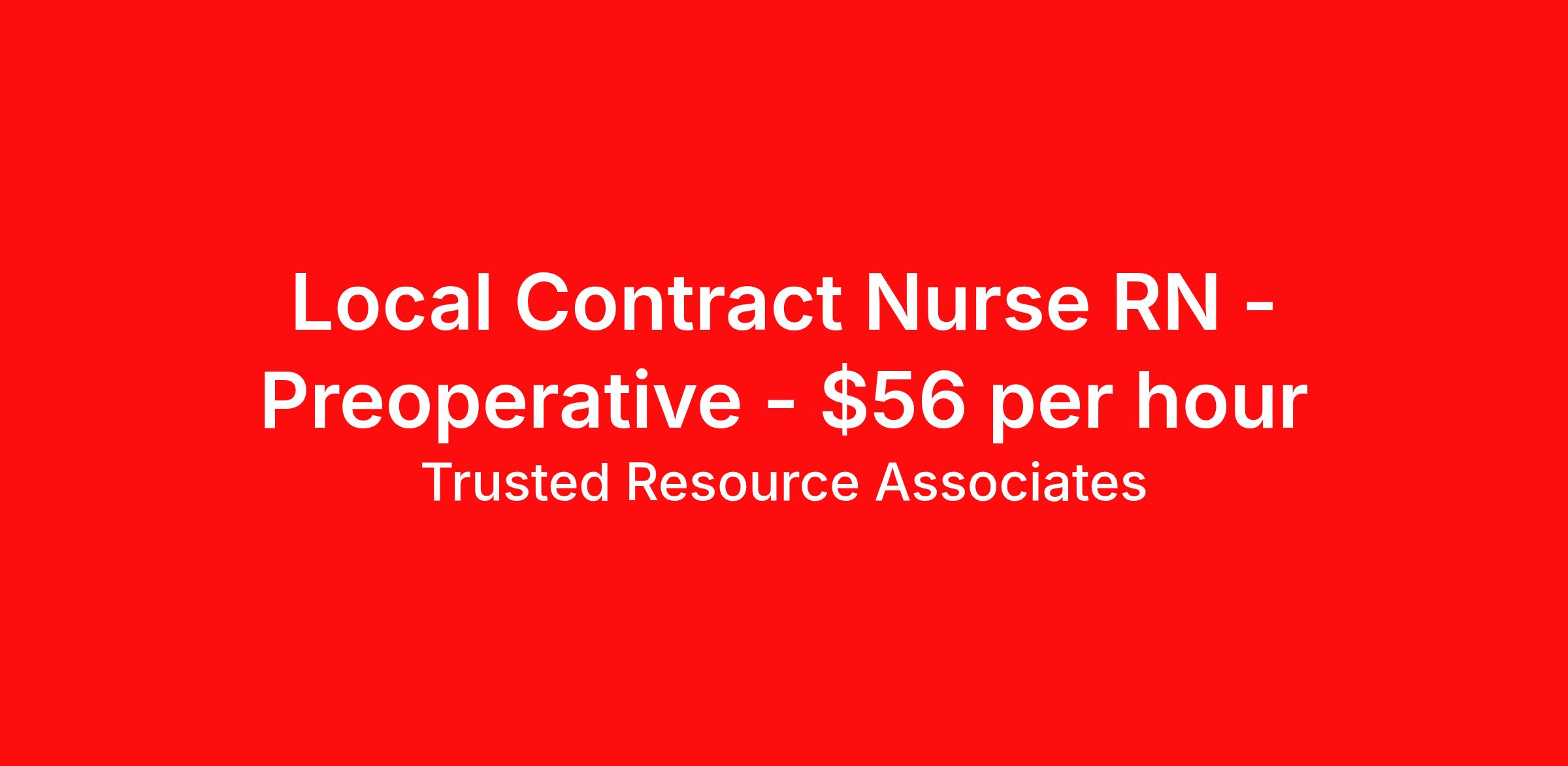 Trusted Resource Associates (TRA) is seeking a local contract nurse RN Preoperative for a local contract nursing job in Memphis, Tennessee. Job Description & Requirements Specialty: Preoperative Discipline: RN Start Date: 04/01/2026 Duration: 13 weeks 40 hours per week Shift: 8 hours, days Employment Type: Local Contract TRA RN Pre Op TRA is Tenet's in-house nationwide contingent pool for Nursing and Allied travel and local contracts. Receive a greater level of Contract security compared to with an outside agency. BENEFITS - Guaranteed hours for Travel Contracts - Preferred Booking Agreement for Local Contracts - Weekly Pay - Holiday Pay - Contract Security compared to a contract with an outside agency Minimum education Graduate of an accredited School of nursing Minimum Experience Must have 2 years of Acute Care nursing experience with a minimum one year current in Pre Op Required Certification/Licensure - Must be currently licensed, certified or registered to practice profession as required by law, regulation in state of practice or policy. Must meet all certification requirements for each nursing specialty supported - American Heart Association - CPR-Basic Life Support - Other credentialing items, such as a skills checklist and health related documents, which will be specified by your Recruiter. Our Hire Process - We do qualify our clinicians to meet or exceed the minimum requirements of a travel or local assignment. If you are qualified, we may direct-hire you, reducing the time we can get you to work! When you reach out to a TRA Recruiter for more details, ensure your Vivian profile includes your most updated resume! Trusted Resource Associates (TRA) Job ID 500148. Benefits 401k retirement plan Weekly pay Holiday Pay Referral bonus