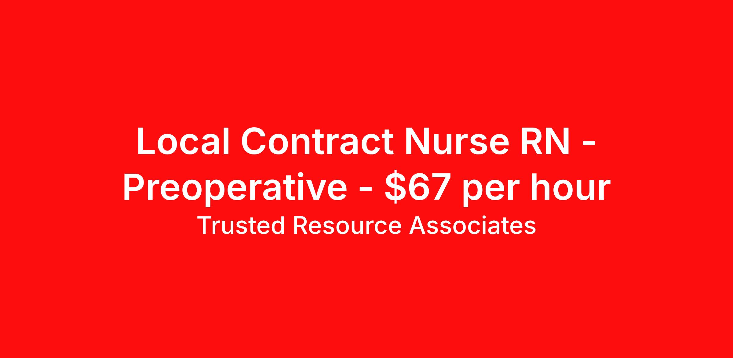 Trusted Resource Associates (TRA) is seeking a local contract nurse RN Preoperative for a local contract nursing job in El Paso, Texas. Job Description & Requirements Specialty: Preoperative Discipline: RN Start Date: 04/01/2026 Duration: 13 weeks 40 hours per week Shift: 8 hours, days Employment Type: Local Contract TRA RN Pre Op TRA is Tenet's in-house nationwide contingent pool for Nursing and Allied travel and local contracts. Receive a greater level of Contract security compared to with an outside agency. BENEFITS - Guaranteed hours for Travel Contracts - Preferred Booking Agreement for Local Contracts - Weekly Pay - Holiday Pay - Contract Security compared to a contract with an outside agency Minimum education Graduate of an accredited School of nursing Minimum Experience Must have 2 years of Acute Care nursing experience with a minimum one year current in Pre Op Required Certification/Licensure - Must be currently licensed, certified or registered to practice profession as required by law, regulation in state of practice or policy. Must meet all certification requirements for each nursing specialty supported - American Heart Association - CPR-Basic Life Support - Other credentialing items, such as a skills checklist and health related documents, which will be specified by your Recruiter. Our Hire Process - We do qualify our clinicians to meet or exceed the minimum requirements of a travel or local assignment. If you are qualified, we may direct-hire you, reducing the time we can get you to work! When you reach out to a TRA Recruiter for more details, ensure your Vivian profile includes your most updated resume! Trusted Resource Associates (TRA) Job ID 500316. Benefits 401k retirement plan Weekly pay Holiday Pay Referral bonus