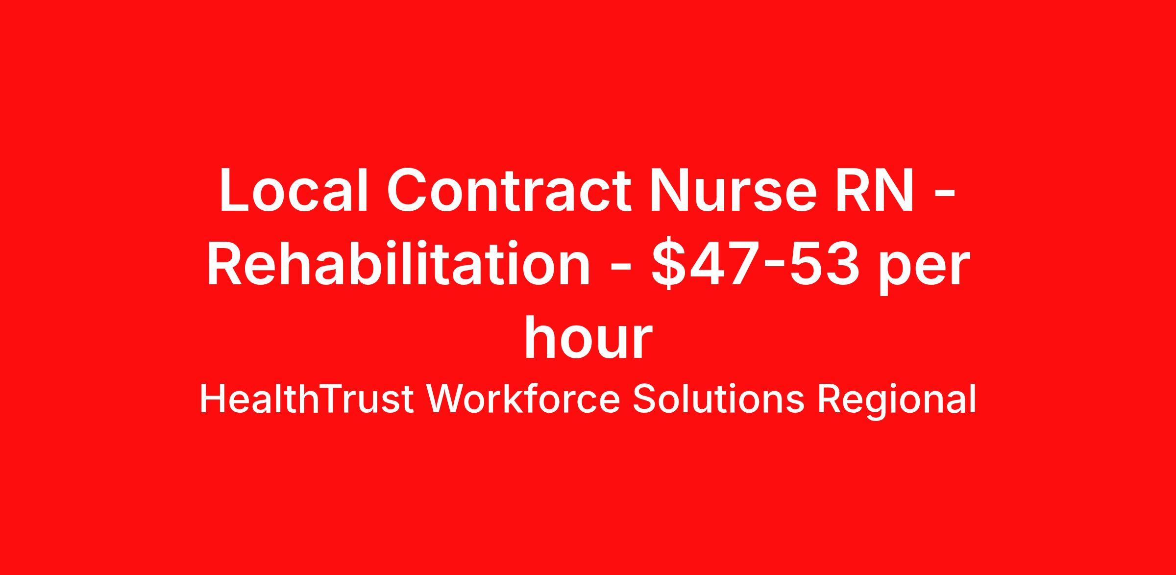 HealthTrust Workforce Solutions Regional is seeking a local contract nurse RN Rehabilitation for a local contract nursing job in Asheville, North Carolina. Job Description & Requirements Specialty: Rehabilitation Discipline: RN Start Date: 04/06/2026 Duration: 13 weeks 36 hours per week Shift: 12 hours, nights Employment Type: Local Contract