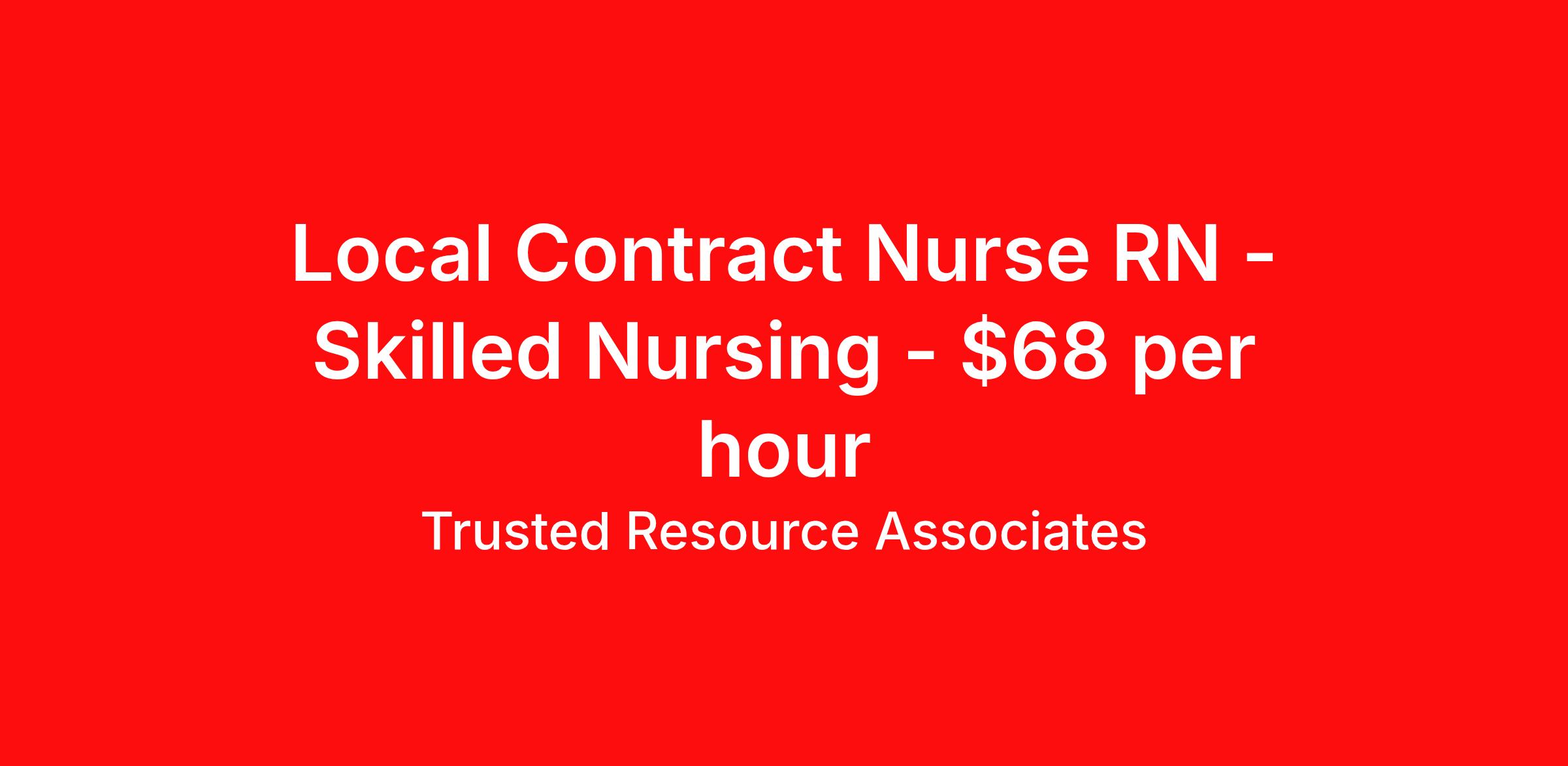 Trusted Resource Associates (TRA) is seeking a local contract nurse RN Skilled Nursing for a local contract nursing job in Joshua Tree, California. Job Description & Requirements Specialty: Skilled Nursing Discipline: RN Start Date: 04/01/2026 Duration: 13 weeks 36 hours per week Shift: 12 hours, days, nights Employment Type: Local Contract TRA RN Skilled Nursing Join Tenet's in-house TRA Nationwide Contingent Pool for Nursing and Allied Health professionals. With TRA, you'll receive greater contract security than with outside agencies while accessing exciting local and travel opportunities across the nation. Why Choose TRA? - Guaranteed Hours for Travel Contracts - Preferred Booking Agreements for Local Contracts - Weekly Pay, Holiday Pay and 401k with a company match - Contract Security: Stability with TRA’s in-house opportunities compared to third-party agencies Our Quick Hire Process: We prioritize hiring qualified clinicians directly for faster deployment. When you reach out to a TRA recruiter, be sure your Vivian profile is updated with your most recent resume to expedite the process! Qualifications: Minimum Education: Graduate of an accredited school of nursing Minimum Experience Required: -2 years of recent Skilled Nursing experience -1 Acute Care experience in work history - Medication Administration to over 25 patients Required Certification/Licensure: Current state licensure or registration as per state laws Specialty certifications as required (must meet certification requirements for each supported nursing specialty) CPR (Basic Life Support) certification from the American Heart Association Position Overview: As a Specialty Registered Nurse, you will deliver high-quality, safe, and effective care to patients on a per-shift basis while also leading and supervising clinical staff. You will collaborate closely with the facility's CNO, ensuring clinical staff competency and effective resource management. Trusted Resource Associates (TRA) Job ID 500246. Benefits 401k retirement plan Weekly pay Holiday Pay Referral bonus