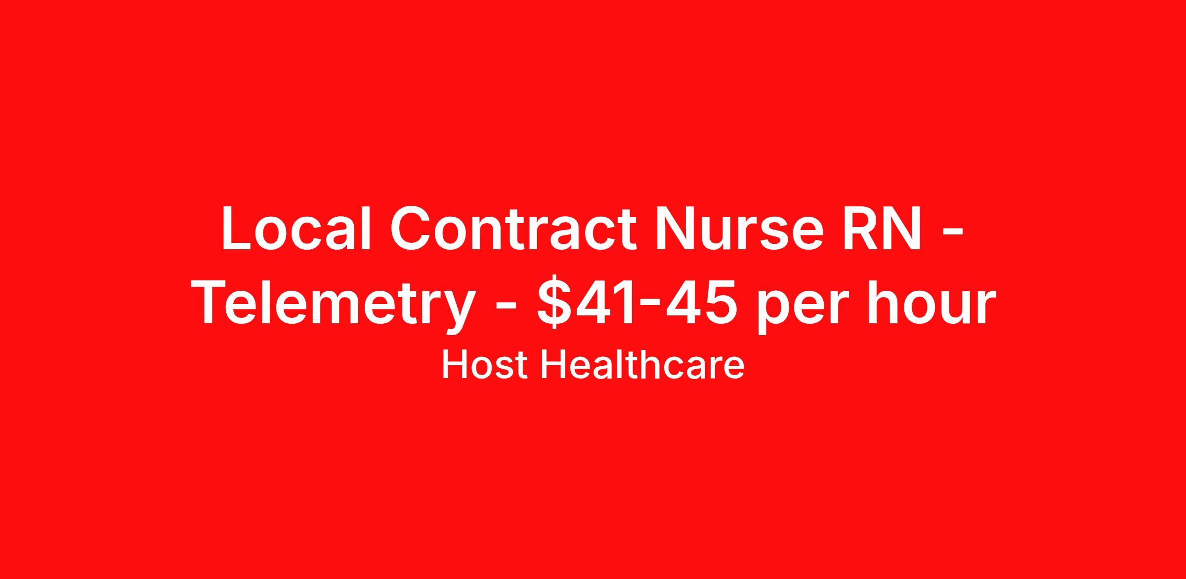 Host Healthcare is seeking a local contract nurse RN Telemetry for a local contract nursing job in Macon, Georgia. Job Description & Requirements Specialty: Telemetry Discipline: RN Start Date: 03/23/2026 Duration: 13 weeks 48 hours per week Shift: 12 hours, nights Employment Type: Local Contract Host Healthcare Job ID La1fVX000002pmz7YAA. Pay package is based on 12 hour shifts and 48 hours per week (subject to confirmation) with tax-free stipend amount to be determined. Posted job title: RN - Telemetry About Host Healthcare At Host Healthcare, we provide a truly comfortable experience as you explore your travel nursing, therapy, or allied career. We make your travel healthcare journey easy by taking care of all the details, so you don’t have to. We are on a mission to help others live better and we do this by helping the healers of the world be as comfortable as possible. With access to tens of thousands of travel nursing, therapy, and allied jobs in all 50 states, our responsive and friendly recruiters find your dream position based on what’s important to you. During your assignment, get access to premium benefits, including Day 1 medical that continues up to 30 days between assignments, 401K matching, travel reimbursements, dedicated housing support, and more. We also offer 24/7 support from our team and access to our on-staff clinicians so you can feel comfortable and confident throughout your entire assignment. Travel comfortably with Host Healthcare. Benefits Referral bonus School loan reimbursement Vision benefits Wellness and fitness programs Company provided housing options License and certification reimbursement Life insurance Medical benefits Mileage reimbursement Pet insurance Discount program Employee assistance programs Guaranteed Hours Health savings account Holiday Pay 401k retirement plan Continuing Education Dental benefits