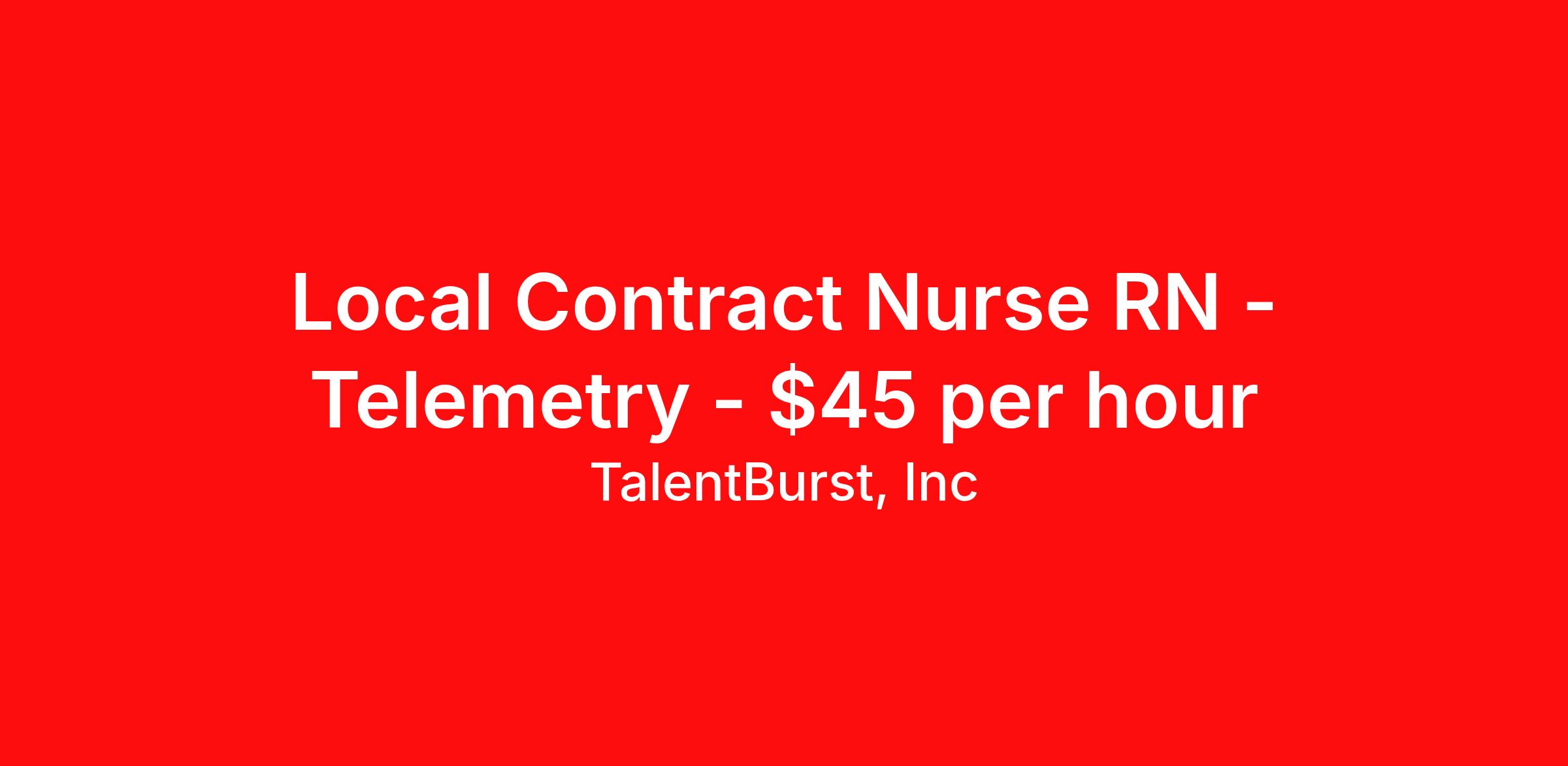 TalentBurst, Inc is seeking a local contract nurse RN Telemetry for a local contract nursing job in Alexandria, Louisiana. Job Description & Requirements Specialty: Telemetry Discipline: RN Start Date: 04/13/2026 Duration: 13 weeks 36 hours per week Shift: 12 hours, nights Employment Type: Local Contract Med surg Telemetry Alexandria, LA Day or Night shifts available Will accept local or travel candidates Long term opportunity 13 weeks to start Local Pay 43-46/hr CANDIDATE MUST HAVE 1-2 YEARS OF NURSING EXPERIENCE & AT LEAST 6 MONTHS OF TELEMETRY EXPERIENCE REQUIRED Licenses, Registrations, or Certifications BLS certification from AHA required ACLS certification from AHA required RN License or compact RN License Type of patients on the unit: Cardiac and Telemetry Is not Stepdown unit Temp to perm is a possibility Weekend Requirement Every other weekend On Call Requirement None Nurse / Patient Ratio 5:1-6:1 depending on staffing Summary: The competent Nurse, in the same or similar clinical setting, practices independently and demonstrates an awareness of all relevant aspects of a situation. Provides routine and complex care, with the ability to on long-range goals or plans. Continues to develop the ability to cope with and manage contingencies of clinical nursing. Makes appropriate assignments and delegates to other care providers as a means to help manage the clinical situation. Responsibilities: Meets expectations of the applicable OneCHRISTUS Competencies: Leader of Self, Leader of Others, or Leader of Leaders. Consistent with the ANA Scope and Standards of Practice, provides nursing care utilizing the nursing process, including assessment, diagnosis, planning, intervention and evaluation for assigned patients. Addresses increasingly complex psychological, emotional, cultural, and social needs of patient and families in accordance with their level of practice. Using the appropriate protocol, administers medications and treatments; monitors for side-effects and effectiveness of the treatment prescribed. Documents patient history, symptoms, medication, and care given. Assess learning needs and provides education to patients, family members and/or care givers; identify issues and resources. Job Requirements: Education/Skills Bachelor of Science Degree in Nursing, preferred Experience 1 year of experience in the related nursing specialty preferred Licenses, Registrations, or Certifications BLS required Current ACLS certification required RN License in state of employment or compact Position Requirements: Education/Skills All newly hired experienced RNs must attend New Nurses Orientation within the first 30 days of hire. New hires are precepted by a designated trained staff member and initial on-boarding requirements are validated through successful completion of the designated organizational entry competency validation and a MedSurg specific competency validation. All newly licensed RNs may participate in a residency program or other specific orientation. Skills completion and competency completion will be achieved with the preceptor at the bedside and documented through the program's tracking software. Completion of all annual competency verification requirements. Experience One year of experience in a related nursing specialty preferred. Work Schedule: 7pm-7am or 7am - 7 pm Work Type: Full Time General Comments Type of patients on the unit: Cardiac and Telemetry Is not Stepdown unit Temp to perm is a possibility TB_RN ZRHC Talent Burst Job ID 26-07379. Posted job title: RN - Telemetry I - NIGHTS About TalentBurst, Inc TalentBurst Health & Life Sciences is an established provider of healthcare workforce solutions, servicing healthcare facilities across the United States for over 15 years. As a Joint Commission Certified Agency, our commitment to quality, integrity, and exceptional service has made us a trusted name in the healthcare staffing landscape. Our mission is to bridge the gap between healthcare professionals seeking fulfilling opportunities and healthcare organizations striving to maintain their high standards of care. We are committed to providing top-notch healthcare professionals with access to facilities where they can focus on delivering exceptional patient care and thrive. Whether you're a nurse, allied health professional, or administrative personnel, we have the expertise to match your skills and aspirations with the perfect placement.