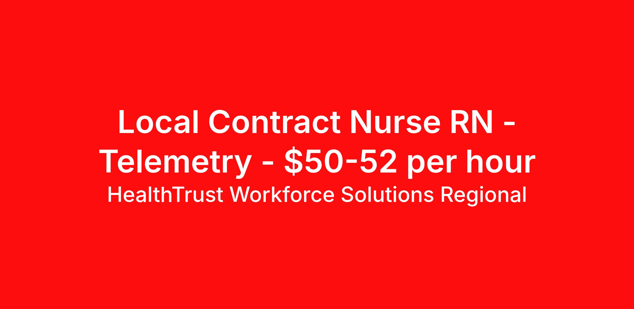 HealthTrust Workforce Solutions Regional is seeking a local contract nurse RN Telemetry for a local contract nursing job in Highlands, North Carolina. Job Description & Requirements Specialty: Telemetry Discipline: RN Duration: 13 weeks 36 hours per week Shift: 12 hours, days Employment Type: Local Contract - Must have 1 year worth of recent Telemetry experience - Must have an active RN license - Must be available every other weekend