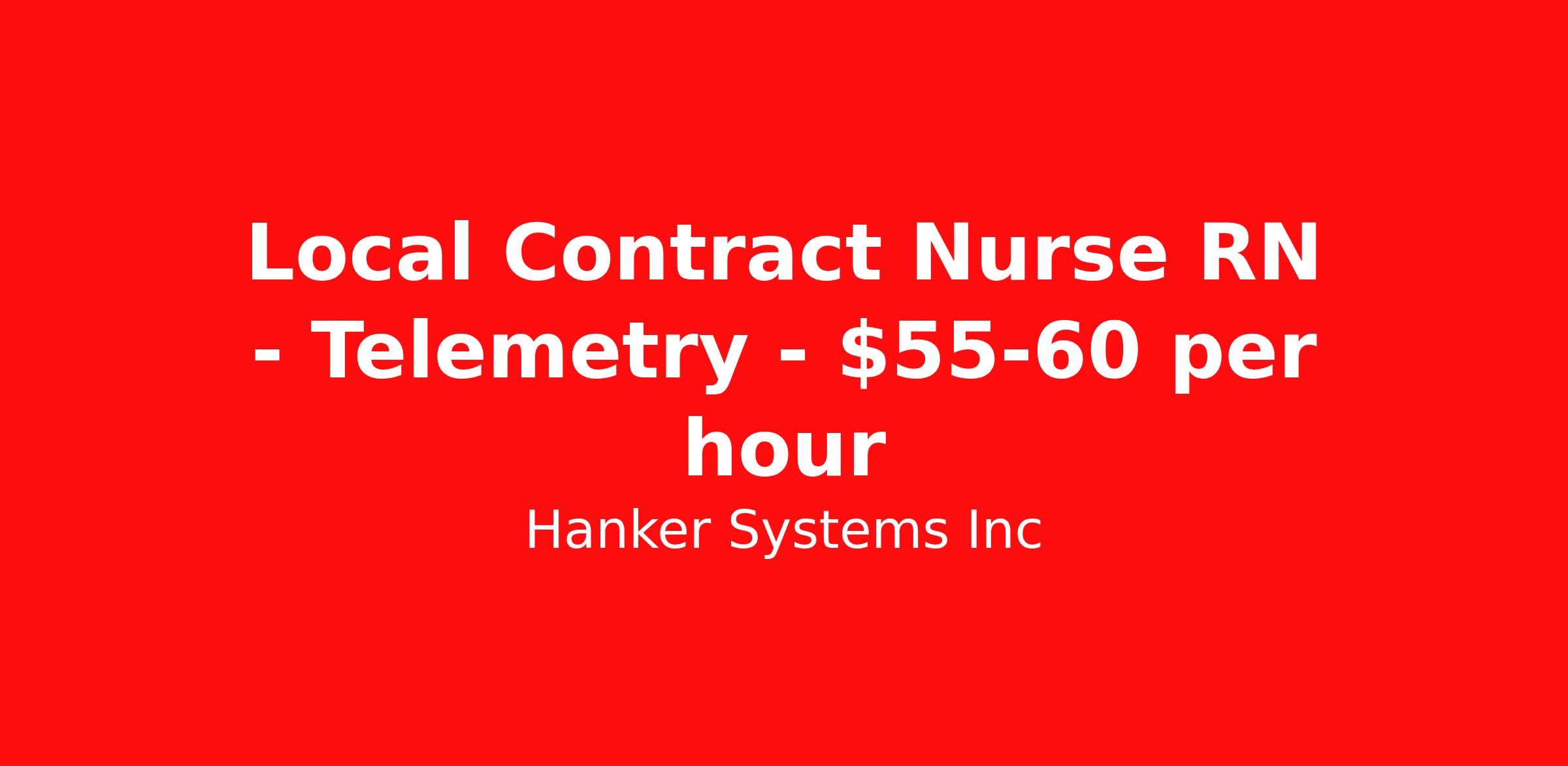 Hanker Systems Inc is seeking a local contract nurse RN Telemetry for a local contract nursing job in Glendale, California. Job Description & Requirements Specialty: Telemetry Discipline: RN Start Date: 03/30/2026 Duration: 13 weeks 36 hours per week Shift: 12 hours, nights Employment Type: Local Contract Registered Nurse – Telemetry (Night Shift) Location: Glendale, CA Department: Telemetry Contract Length: 13 Weeks Shift: Night Shift | 7:00 PM – 7:30 AM | 12‑hour shifts Hours: 36–48 hours/week ⭐ Position Overview This facility is seeking experienced Telemetry Registered Nurses for an ASAP start. This is an auto‑offer unit—qualified candidates with complete profiles move directly to offer without an interview. RNs will work night shifts with the possibility of floating to Med‑Surg depending on census and staffing needs. Candidates must have strong cardiac monitoring experience and proficiency with Cerner . Key Responsibilities Provide evidence‑based care to telemetry patients Interpret cardiac rhythms and monitor continuous telemetry Administer medications including cardiac drips and interventions Perform frequent assessments, documentation, and patient education Collaborate with multidisciplinary teams to support patient recovery Safely float to Medical‑Surgical units within competency Maintain infection prevention and hospital safety standards Document within Cerner (required) Required Qualifications Active RN license in state of practice Minimum 2 years Telemetry RN experience Must have worked in Telemetry within the last 3 months Cerner experience REQUIRED (hard stop) BLS (AHA) ACLS (AHA) BSN preferred Acute‑care hospital experience preferred About Hanker Systems Inc Healthcare staffing at Hanker Systems Inc is focused on delivering the right talent to support quality patient care. We partner with healthcare organizations to provide skilled clinical, health IT, and administrative professionals when and where they are needed most. We follow strict compliance and credentialing standards, ensuring reliability, accuracy, and trust in every placement. Our employees play a vital role in strengthening healthcare teams, supporting clinicians, and helping organizations operate smoothly. At Hanker Systems, healthcare staffing is more than filling roles—it’s about making a real difference in patient outcomes. Benefits License and certification reimbursement Referral bonus