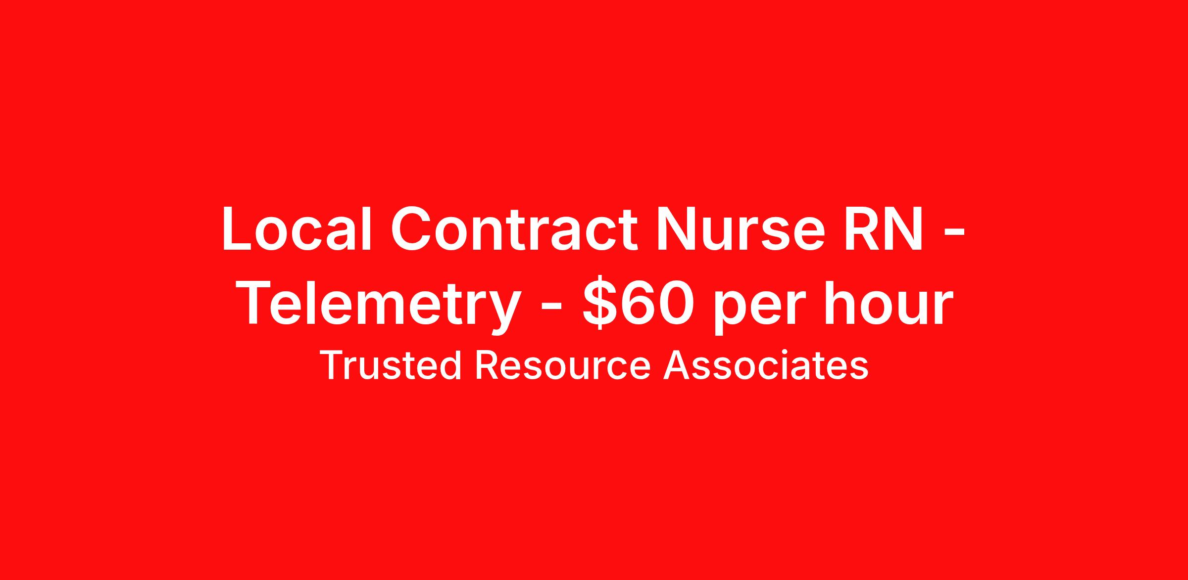 Trusted Resource Associates (TRA) is seeking a local contract nurse RN Telemetry for a local contract nursing job in El Paso, Texas. Job Description & Requirements Specialty: Telemetry Discipline: RN Start Date: 04/01/2026 Duration: 13 weeks 36 hours per week Shift: 12 hours, days Employment Type: Local Contract TRA RN Telemetry TRA is Tenet's in-house nationwide contingent pool for Nursing and Allied travel and local contracts. Receive a greater level of Contract security compared to with an outside agency. BENEFITS - Guaranteed hours for Travel Contracts - Preferred Booking Agreement for Local Contracts - Weekly Pay - Holiday Pay - Contract Security compared to a contract with an outside agency Minimum education Graduate of an accredited School of nursing Minimum Experience Must have 2 years of Acute Care nursing experience with a minimum one year current in telemetry. Required Certification/Licensure - Must be currently licensed, certified or registered to practice profession as required by law, regulation in state of practice or policy. Must meet all certification requirements for each nursing specialty supported - American Heart Association - CPR-Basic Life Support - Other credentialing items, such as a skills checklist and health related documents, which will be specified by your Recruiter. Our Hire Process - We do qualify our clinicians to meet or exceed the minimum requirements of a travel or local assignment. If you are qualified, we may direct-hire you, reducing the time we can get you to work! When you reach out to a TRA Recruiter for more details, ensure your Vivian profile includes your most updated resume! Trusted Resource Associates (TRA) Job ID 500318. Benefits 401k retirement plan Weekly pay Holiday Pay Referral bonus