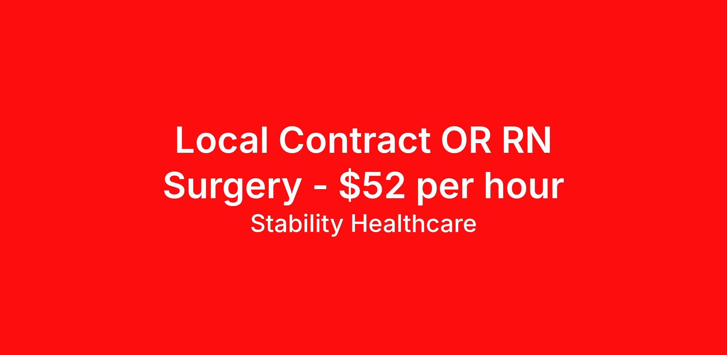 Stability Healthcare is seeking a local contract nurse RN OR - Operating Room for a local contract nursing job in Reno, Nevada. Job Description & Requirements Specialty: OR - Operating Room Discipline: RN Duration: 13 weeks 36 hours per week Shift: 12 hours, days Employment Type: Local Contract Stability Healthcare is looking for a OR RN contract position in Reno, NV. Also known as perioperative nurses, operating room (OR) nurses provide care for patients before, during, and after surgical procedures. Perioperative nurses work in every type of healthcare facility. *$600 travel bonus *Day 1 health insurance with United Healthcare *PTO plan start accruing on day 1, use during contract or cash out at the end! *Guaranteed stipend if facility calls you off *Extra hour bonus earn an additional hourly bonus for working over your weekly contracted hours Stability Job ID L-816837. Pay package is based on 12 hour shifts and 36 hours per week (subject to confirmation) with tax-free stipend amount to be determined. Posted job title: OR About Stability Healthcare Stability Healthcare was founded in 2009, with the mission of becoming the best Travel Nursing Agency in California. We have been rated one of the top travel nursing agencies and offer our nurses the highest paying travel nursing jobs available. We have access to the best travel assignments from 1000’s of facilities. You can start the year off in sunny California, spend the Spring in the Colorado Rockies, enjoy the Summer in the Mid-West, experience the change of seasons in Boston and New York, and hit the beaches of Florida in the winter. Our Nurses work in the best hospitals and health systems in the country. Benefits Guaranteed Hours Benefits start day 1