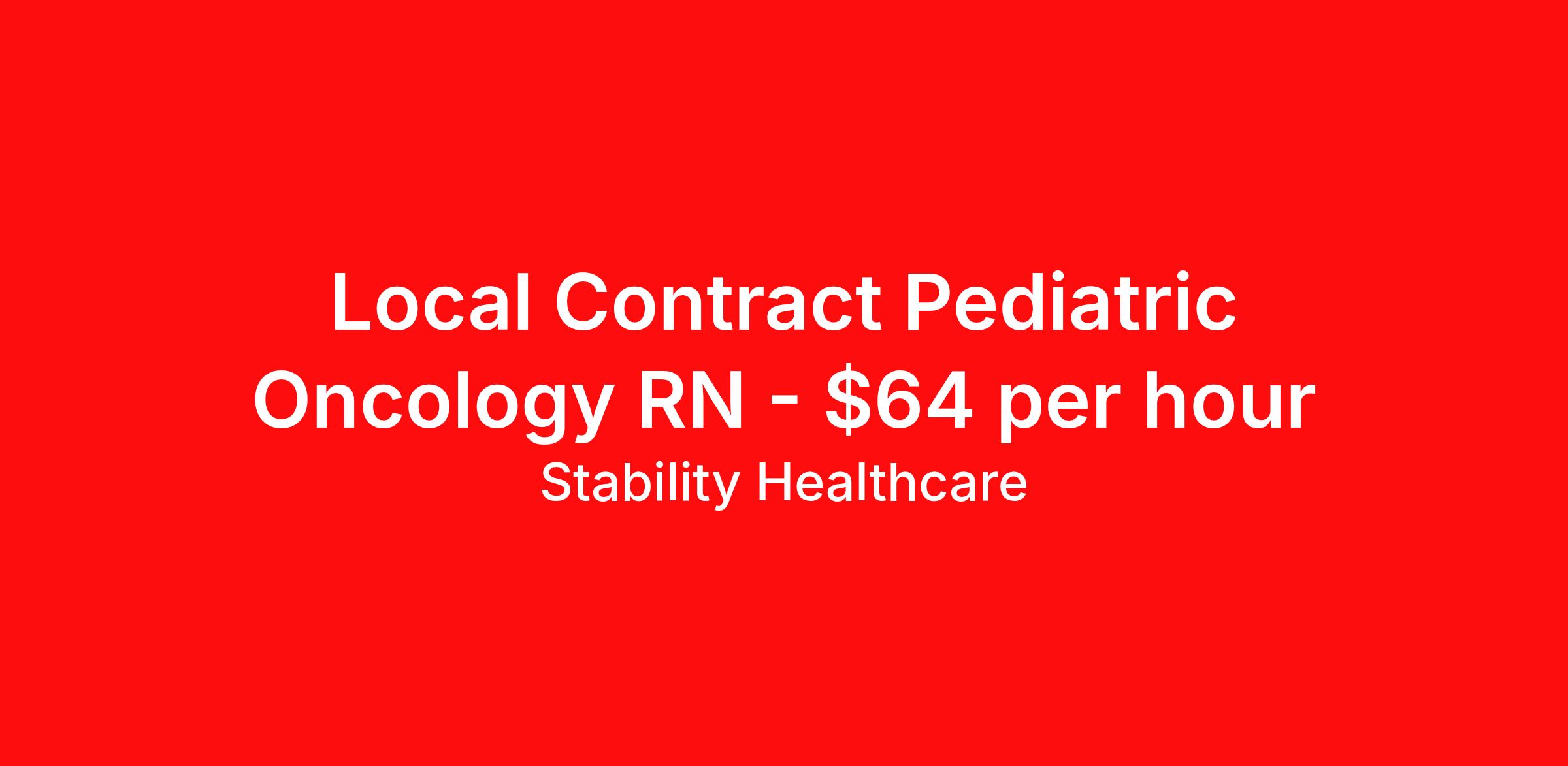 Stability Healthcare is seeking a local contract nurse RN Pediatric Hematology / Oncology for a local contract nursing job in Houston, Texas. Job Description & Requirements Specialty: Pediatric Hematology / Oncology Discipline: RN Duration: 13 weeks 36 hours per week Shift: 12 hours, nights Employment Type: Local Contract Stability Healthcare is looking for a Peds Onc RN contract position in Houston, TX. Pediatric oncologists examine patients, order diagnostic tests, make diagnoses and prescribe treatments. They may also counsel patients and their families on how to deal with their illnesses. Pediatric oncologists often head a treatment team, consisting of other physicians and healthcare workers. Since most conduct research and teach in addition to treating patients, they are usually employed by medical schools or hospitals. However, a minority choose to go into private practice. *$600 travel bonus *Day 1 health insurance with United Healthcare *PTO plan start accruing on day 1, use during contract or cash out at the end! *Guaranteed stipend if facility calls you off *Extra hour bonus earn an additional hourly bonus for working over your weekly contracted hours Stability Job ID L-817723. Pay package is based on 12 hour shifts and 36 hours per week (subject to confirmation) with tax-free stipend amount to be determined. Posted job title: Peds Onc About Stability Healthcare Stability Healthcare was founded in 2009, with the mission of becoming the best Travel Nursing Agency in California. We have been rated one of the top travel nursing agencies and offer our nurses the highest paying travel nursing jobs available. We have access to the best travel assignments from 1000’s of facilities. You can start the year off in sunny California, spend the Spring in the Colorado Rockies, enjoy the Summer in the Mid-West, experience the change of seasons in Boston and New York, and hit the beaches of Florida in the winter. Our Nurses work in the best hospitals and health systems in the country. Benefits Guaranteed Hours Benefits start day 1