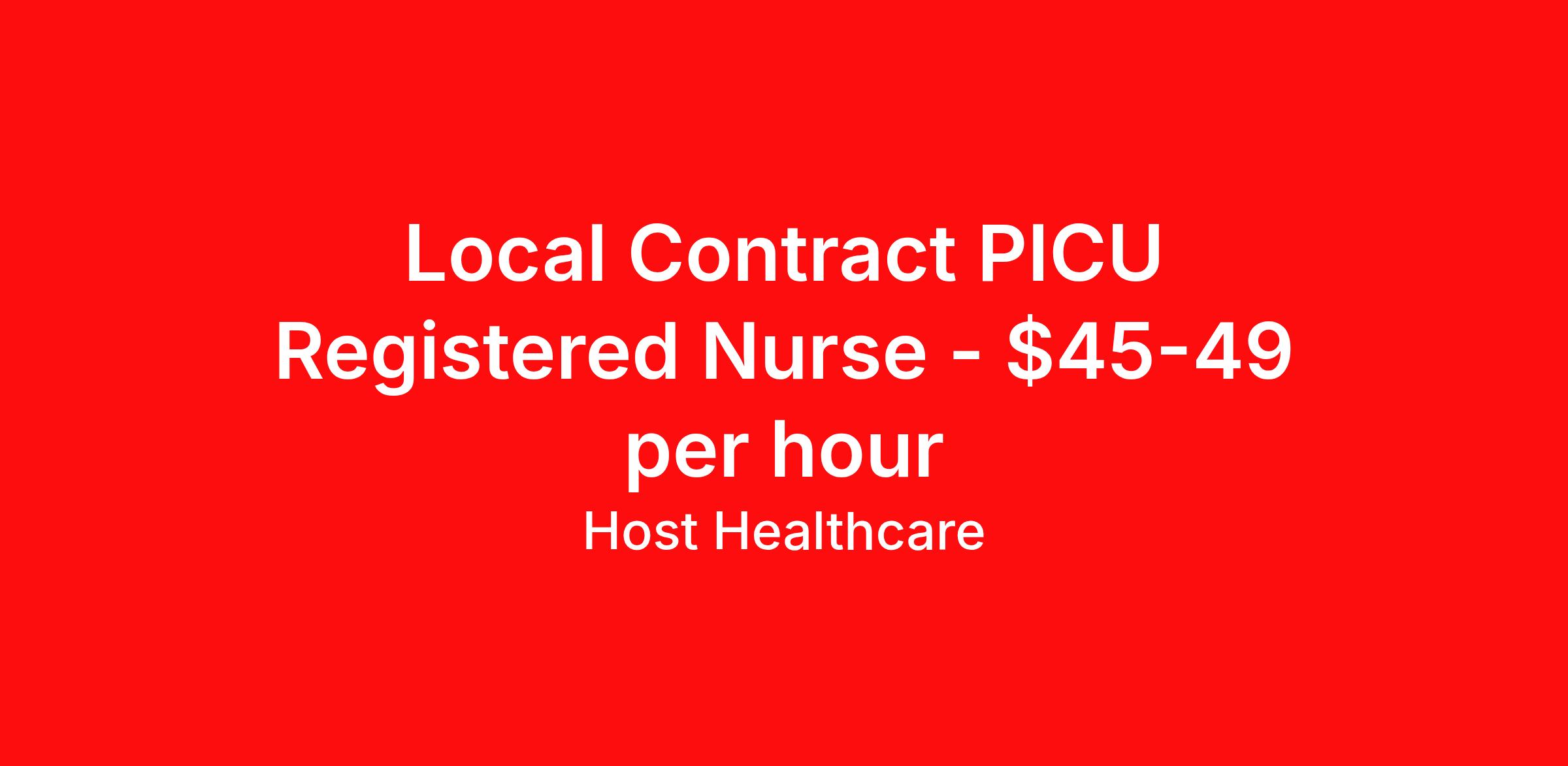 Host Healthcare is seeking a local contract nurse RN PICU - Pediatric Intensive Care for a local contract nursing job in Seattle, Washington. Job Description & Requirements Specialty: PICU - Pediatric Intensive Care Discipline: RN Start Date: 04/06/2026 Duration: 13 weeks 36 hours per week Shift: 12 hours, nights Employment Type: Local Contract Host Healthcare Job ID La1fVX000002ujkTYAQ. Pay package is based on 12 hour shifts and 36 hours per week (subject to confirmation) with tax-free stipend amount to be determined. Posted job title: RN - PICU About Host Healthcare At Host Healthcare, we provide a truly comfortable experience as you explore your travel nursing, therapy, or allied career. We make your travel healthcare journey easy by taking care of all the details, so you don’t have to. We are on a mission to help others live better and we do this by helping the healers of the world be as comfortable as possible. With access to tens of thousands of travel nursing, therapy, and allied jobs in all 50 states, our responsive and friendly recruiters find your dream position based on what’s important to you. During your assignment, get access to premium benefits, including Day 1 medical that continues up to 30 days between assignments, 401K matching, travel reimbursements, dedicated housing support, and more. We also offer 24/7 support from our team and access to our on-staff clinicians so you can feel comfortable and confident throughout your entire assignment. Travel comfortably with Host Healthcare. Benefits Referral bonus School loan reimbursement Vision benefits Wellness and fitness programs Company provided housing options License and certification reimbursement Life insurance Medical benefits Mileage reimbursement Pet insurance Discount program Employee assistance programs Guaranteed Hours Health savings account Holiday Pay 401k retirement plan Continuing Education Dental benefits