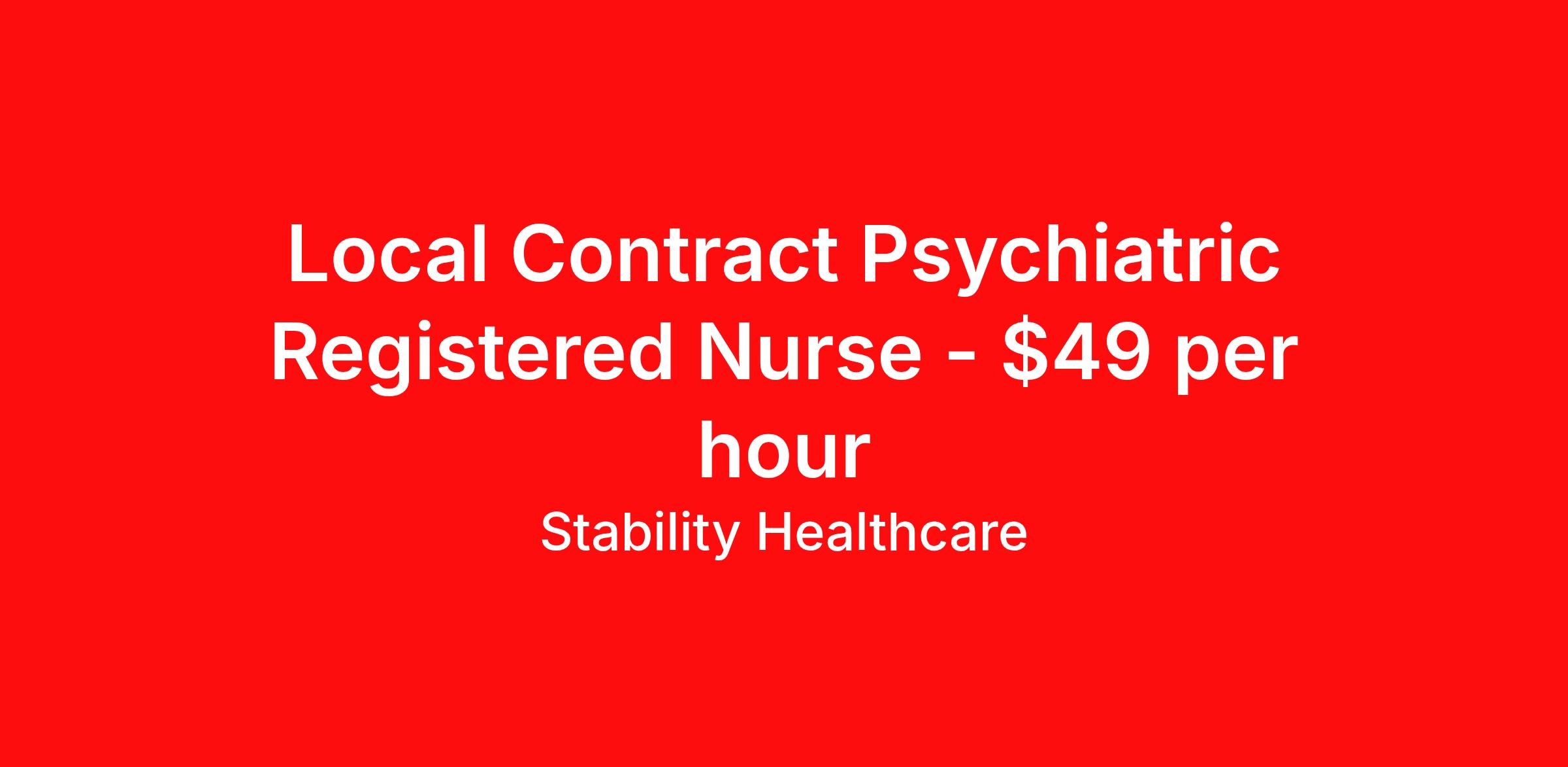 Stability Healthcare is seeking a local contract nurse RN Psychiatric for a local contract nursing job in Manchester, Connecticut. Job Description & Requirements Specialty: Psychiatric Discipline: RN Duration: 13 weeks 40 hours per week Shift: 8 hours, evenings Employment Type: Local Contract Stability Healthcare is looking for a Psych RN contract position in Manchester, CT. It takes a special form of caring to be a psychiatric (psych) nurse. Psychiatric Nurses care for patients with psych/mental issues including addictions and depression. Care may be given in a psych facility, unit in a hospital or specific part of the ER. They're also trained in behavioral therapy, providing tools to teach patients as well as family members how to cope with psychiatric disorders. *$600 travel bonus *Day 1 health insurance with United Healthcare *PTO plan start accruing on day 1, use during contract or cash out at the end! *Guaranteed stipend if facility calls you off *Extra hour bonus earn an additional hourly bonus for working over your weekly contracted hours Stability Job ID L-823609. Pay package is based on 8 hour shifts and 40 hours per week (subject to confirmation) with tax-free stipend amount to be determined. Posted job title: Psych About Stability Healthcare Stability Healthcare was founded in 2009, with the mission of becoming the best Travel Nursing Agency in California. We have been rated one of the top travel nursing agencies and offer our nurses the highest paying travel nursing jobs available. We have access to the best travel assignments from 1000’s of facilities. You can start the year off in sunny California, spend the Spring in the Colorado Rockies, enjoy the Summer in the Mid-West, experience the change of seasons in Boston and New York, and hit the beaches of Florida in the winter. Our Nurses work in the best hospitals and health systems in the country. Benefits Guaranteed Hours Benefits start day 1