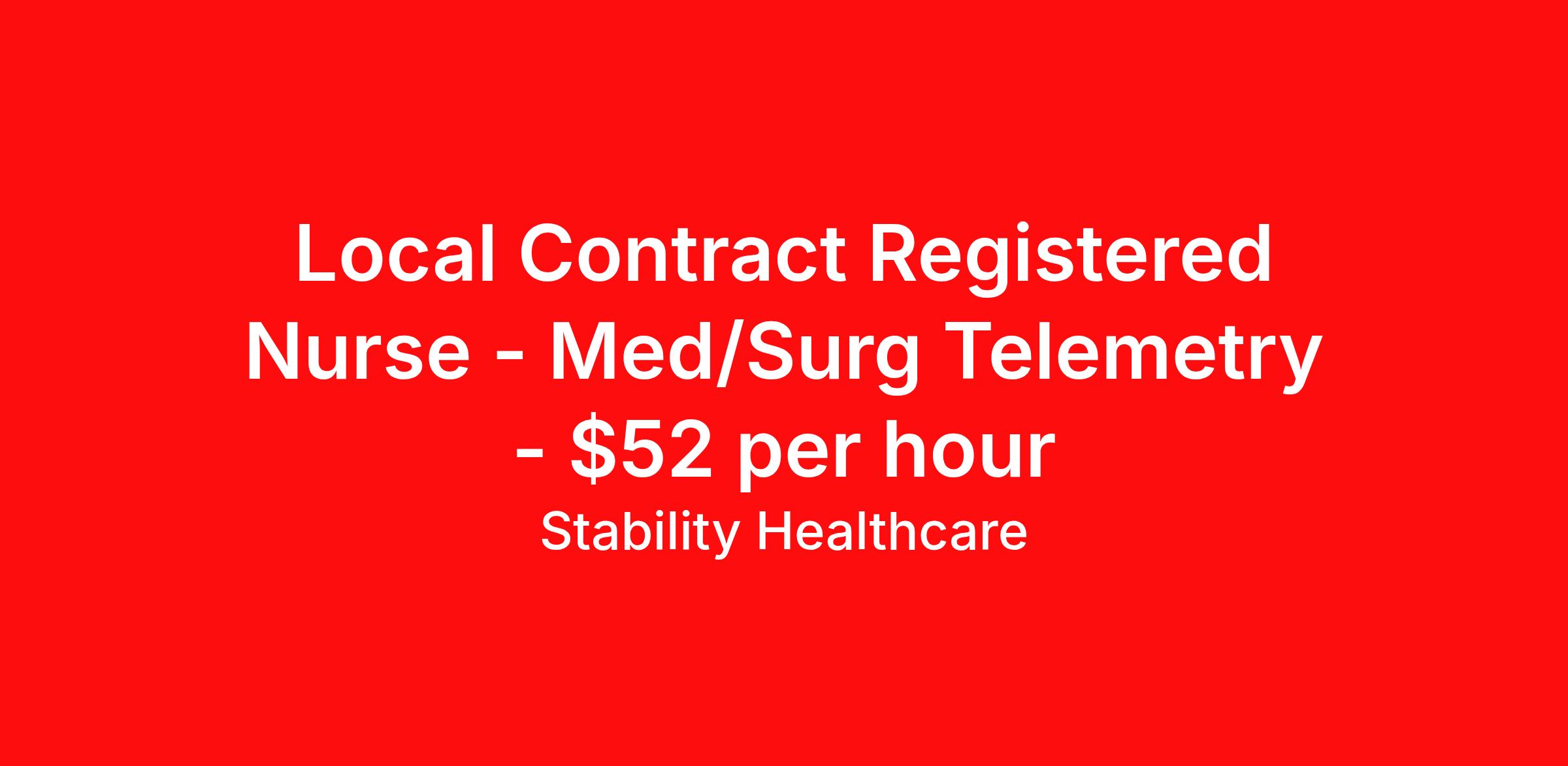 Stability Healthcare is seeking a local contract nurse RN Med Surg / Telemetry for a local contract nursing job in Des Moines, Iowa. Job Description & Requirements Specialty: Med Surg / Telemetry Discipline: RN Duration: 13 weeks 36 hours per week Shift: 12 hours, nights Employment Type: Local Contract Stability Healthcare is looking for a Tele Med-Surg RN contract position in Des Moines, IA. The Medical Surgical Telemetry Registered Nurse (RN) provides direct nursing care in accordance with established policies, procedures and protocols of the healthcare organization often specializing in Neuro, Ortho or Cardiac patients. *$600 travel bonus *Day 1 health insurance with United Healthcare *PTO plan start accruing on day 1, use during contract or cash out at the end! *Guaranteed stipend if facility calls you off *Extra hour bonus earn an additional hourly bonus for working over your weekly contracted hours Stability Job ID L-823685. Pay package is based on 12 hour shifts and 36 hours per week (subject to confirmation) with tax-free stipend amount to be determined. Posted job title: Tele Med-Surg About Stability Healthcare Stability Healthcare was founded in 2009, with the mission of becoming the best Travel Nursing Agency in California. We have been rated one of the top travel nursing agencies and offer our nurses the highest paying travel nursing jobs available. We have access to the best travel assignments from 1000’s of facilities. You can start the year off in sunny California, spend the Spring in the Colorado Rockies, enjoy the Summer in the Mid-West, experience the change of seasons in Boston and New York, and hit the beaches of Florida in the winter. Our Nurses work in the best hospitals and health systems in the country. Benefits Guaranteed Hours Benefits start day 1