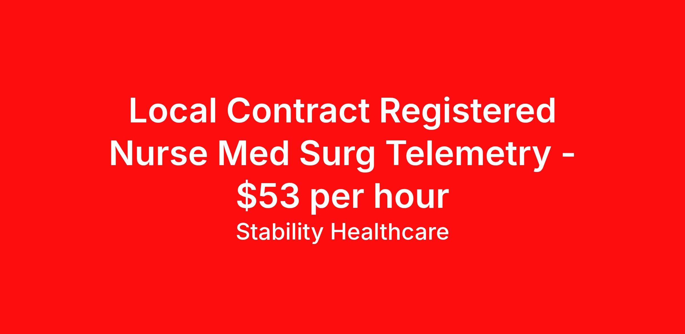 Stability Healthcare is seeking a local contract nurse RN Med Surg / Telemetry for a local contract nursing job in Des Moines, Iowa. Job Description & Requirements Specialty: Med Surg / Telemetry Discipline: RN Start Date: 04/13/2026 Duration: 13 weeks 36 hours per week Shift: 12 hours, nights Employment Type: Local Contract Stability Healthcare is looking for a Tele Med-Surg RN contract position in Des Moines, IA. The Medical Surgical Telemetry Registered Nurse (RN) provides direct nursing care in accordance with established policies, procedures and protocols of the healthcare organization often specializing in Neuro, Ortho or Cardiac patients. *$600 travel bonus *Day 1 health insurance with United Healthcare *PTO plan start accruing on day 1, use during contract or cash out at the end! *Guaranteed stipend if facility calls you off *Extra hour bonus earn an additional hourly bonus for working over your weekly contracted hours Stability Job ID L-828278. Pay package is based on 12 hour shifts and 36 hours per week (subject to confirmation) with tax-free stipend amount to be determined. Posted job title: Tele Med-Surg About Stability Healthcare Stability Healthcare was founded in 2009, with the mission of becoming the best Travel Nursing Agency in California. We have been rated one of the top travel nursing agencies and offer our nurses the highest paying travel nursing jobs available. We have access to the best travel assignments from 1000’s of facilities. You can start the year off in sunny California, spend the Spring in the Colorado Rockies, enjoy the Summer in the Mid-West, experience the change of seasons in Boston and New York, and hit the beaches of Florida in the winter. Our Nurses work in the best hospitals and health systems in the country. Benefits Guaranteed Hours Benefits start day 1