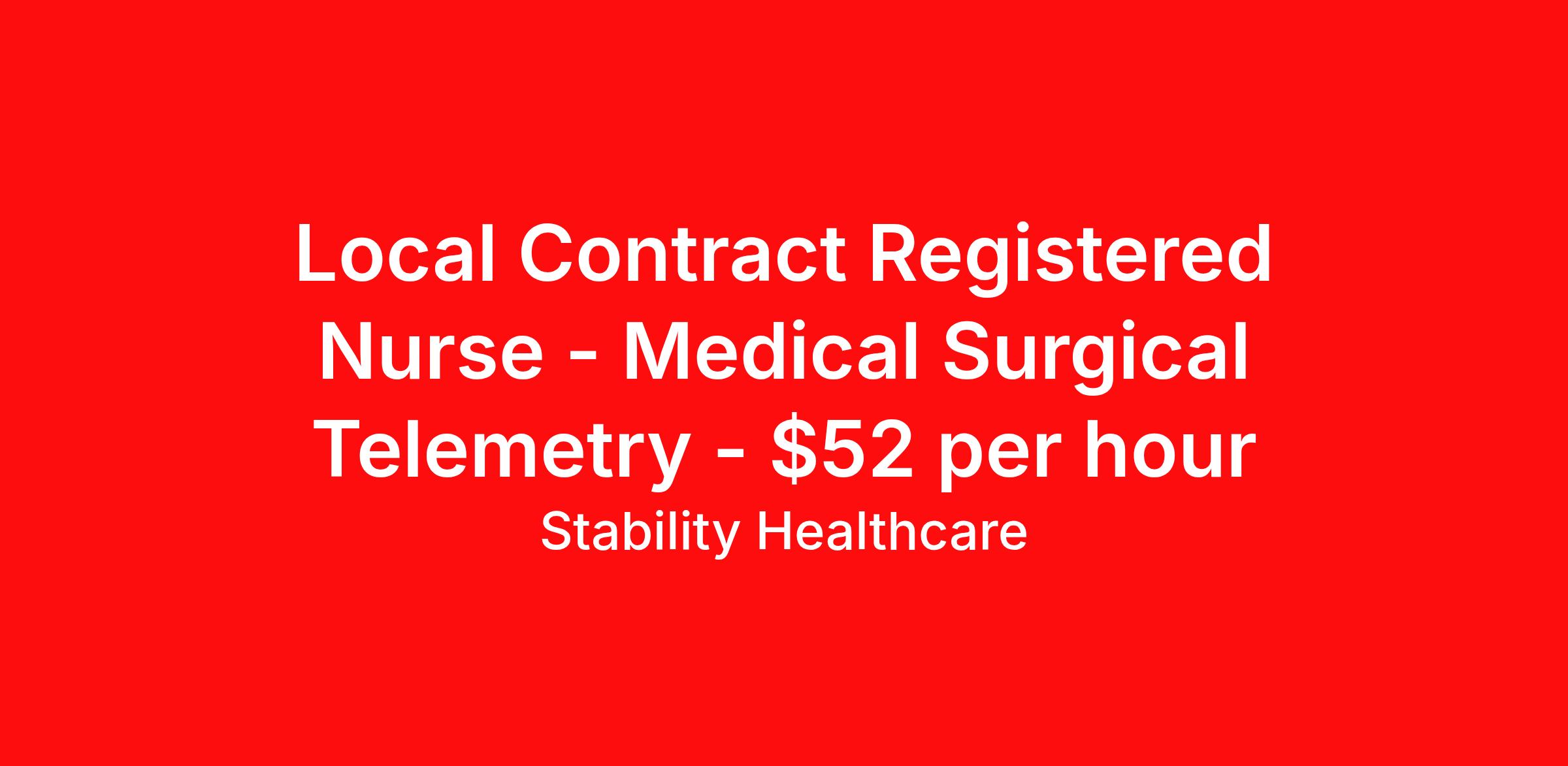 Stability Healthcare is seeking a local contract nurse RN Med Surg / Telemetry for a local contract nursing job in Newburgh, Indiana. Job Description & Requirements Specialty: Med Surg / Telemetry Discipline: RN Duration: 13 weeks 36 hours per week Shift: 12 hours, days Employment Type: Local Contract Stability Healthcare is looking for a Tele Med-Surg RN contract position in Newburgh, IN. The Medical Surgical Telemetry Registered Nurse (RN) provides direct nursing care in accordance with established policies, procedures and protocols of the healthcare organization often specializing in Neuro, Ortho or Cardiac patients. *$600 travel bonus *Day 1 health insurance with United Healthcare *PTO plan start accruing on day 1, use during contract or cash out at the end! *Guaranteed stipend if facility calls you off *Extra hour bonus earn an additional hourly bonus for working over your weekly contracted hours Stability Job ID L-824273. Pay package is based on 12 hour shifts and 36 hours per week (subject to confirmation) with tax-free stipend amount to be determined. Posted job title: Tele Med-Surg About Stability Healthcare Stability Healthcare was founded in 2009, with the mission of becoming the best Travel Nursing Agency in California. We have been rated one of the top travel nursing agencies and offer our nurses the highest paying travel nursing jobs available. We have access to the best travel assignments from 1000’s of facilities. You can start the year off in sunny California, spend the Spring in the Colorado Rockies, enjoy the Summer in the Mid-West, experience the change of seasons in Boston and New York, and hit the beaches of Florida in the winter. Our Nurses work in the best hospitals and health systems in the country. Benefits Guaranteed Hours Benefits start day 1