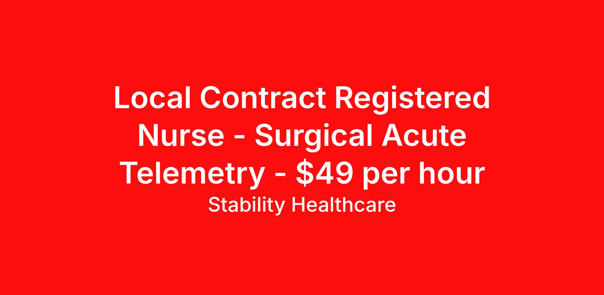 Stability Healthcare is seeking a local contract nurse RN Telemetry for a local contract nursing job in Phoenix, Arizona. Job Description & Requirements Specialty: Telemetry Discipline: RN Duration: 13 weeks 36 hours per week Shift: 12 hours, nights Employment Type: Local Contract Stability Healthcare is looking for a Telemetry RN contract position in Phoenix, AZ. Telemetry nurses care for patients by using medical equipment to monitor blood pressure, heart rate, blood oxygen level, breathing rate, and other vital signs. Commonly, these patients have recently undergone surgery. *$600 travel bonus *Day 1 health insurance with United Healthcare *PTO plan start accruing on day 1, use during contract or cash out at the end! *Guaranteed stipend if facility calls you off *Extra hour bonus earn an additional hourly bonus for working over your weekly contracted hours Stability Job ID L-823771. Pay package is based on 12 hour shifts and 36 hours per week (subject to confirmation) with tax-free stipend amount to be determined. Posted job title: Telemetry About Stability Healthcare Stability Healthcare was founded in 2009, with the mission of becoming the best Travel Nursing Agency in California. We have been rated one of the top travel nursing agencies and offer our nurses the highest paying travel nursing jobs available. We have access to the best travel assignments from 1000’s of facilities. You can start the year off in sunny California, spend the Spring in the Colorado Rockies, enjoy the Summer in the Mid-West, experience the change of seasons in Boston and New York, and hit the beaches of Florida in the winter. Our Nurses work in the best hospitals and health systems in the country. Benefits Guaranteed Hours Benefits start day 1