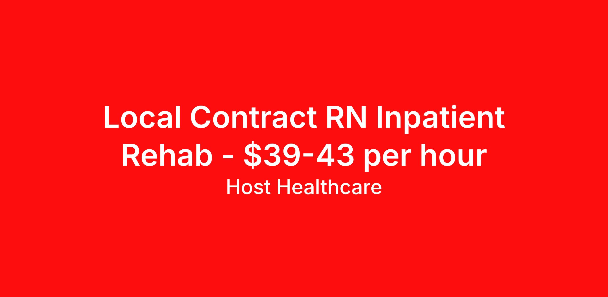 Host Healthcare is seeking a local contract nurse RN Rehabilitation for a local contract nursing job in Waco, Texas. Job Description & Requirements Specialty: Rehabilitation Discipline: RN Start Date: 05/17/2026 Duration: 13 weeks 36 hours per week Shift: 12 hours, days Employment Type: Local Contract Host Healthcare Job ID La1fVX0000039wZKYAY. Pay package is based on 12 hour shifts and 36 hours per week (subject to confirmation) with tax-free stipend amount to be determined. Posted job title: RN - Rehab About Host Healthcare At Host Healthcare, we provide a truly comfortable experience as you explore your travel nursing, therapy, or allied career. We make your travel healthcare journey easy by taking care of all the details, so you don’t have to. We are on a mission to help others live better and we do this by helping the healers of the world be as comfortable as possible. With access to tens of thousands of travel nursing, therapy, and allied jobs in all 50 states, our responsive and friendly recruiters find your dream position based on what’s important to you. During your assignment, get access to premium benefits, including Day 1 medical that continues up to 30 days between assignments, 401K matching, travel reimbursements, dedicated housing support, and more. We also offer 24/7 support from our team and access to our on-staff clinicians so you can feel comfortable and confident throughout your entire assignment. Travel comfortably with Host Healthcare. Benefits Referral bonus School loan reimbursement Vision benefits Wellness and fitness programs Company provided housing options License and certification reimbursement Life insurance Medical benefits Mileage reimbursement Pet insurance Discount program Employee assistance programs Guaranteed Hours Health savings account Holiday Pay 401k retirement plan Continuing Education Dental benefits