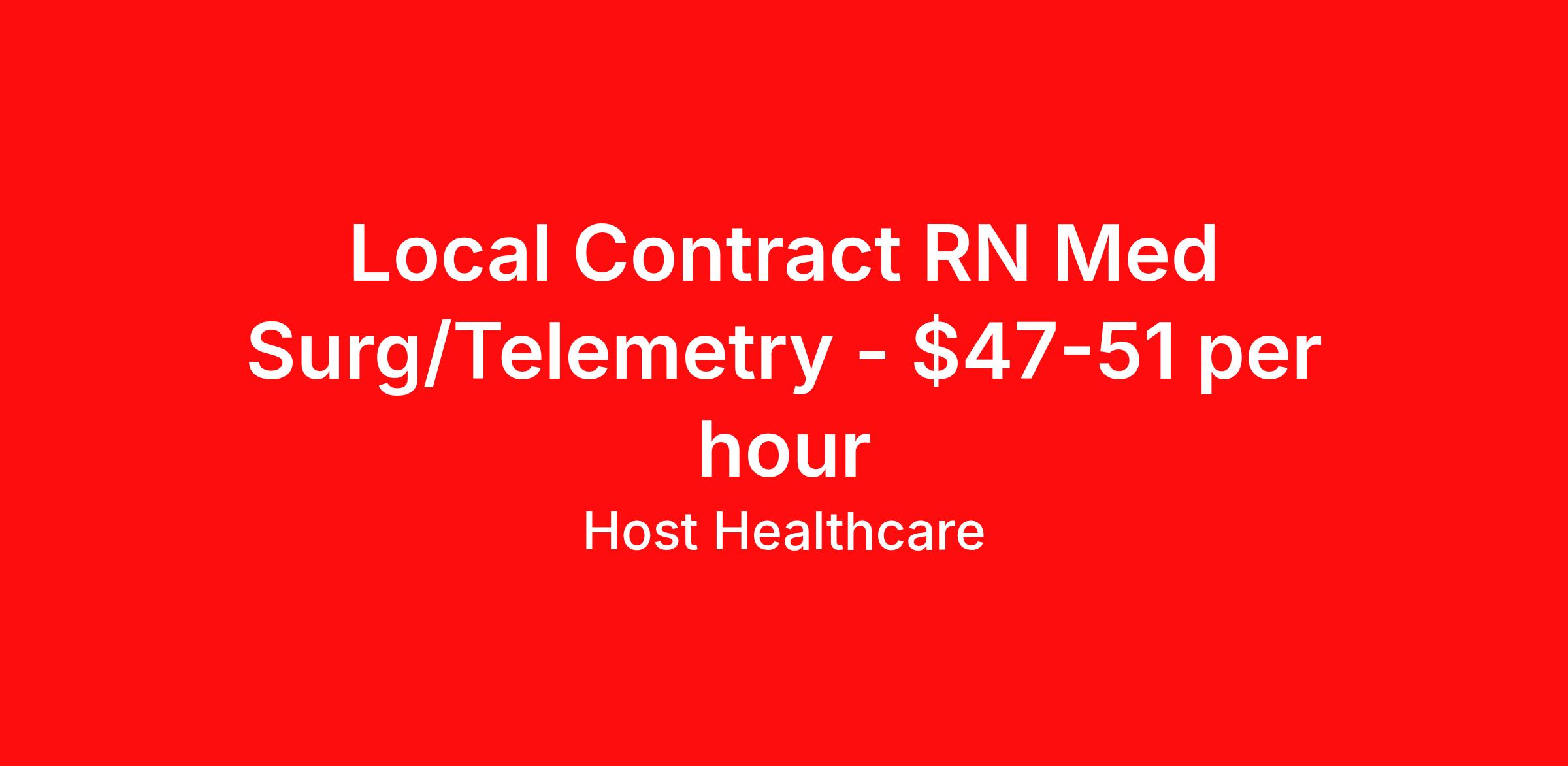 Host Healthcare is seeking a local contract nurse RN Med Surg / Telemetry for a local contract nursing job in Elko, Nevada. Job Description & Requirements Specialty: Med Surg / Telemetry Discipline: RN Start Date: 04/13/2026 Duration: 13 weeks 36 hours per week Shift: 12 hours, nights Employment Type: Local Contract Host Healthcare Job ID La1fVX000002sjdJYAQ. Pay package is based on 12 hour shifts and 36 hours per week (subject to confirmation) with tax-free stipend amount to be determined. Posted job title: RN - Medical-Surgical About Host Healthcare At Host Healthcare, we provide a truly comfortable experience as you explore your travel nursing, therapy, or allied career. We make your travel healthcare journey easy by taking care of all the details, so you don’t have to. We are on a mission to help others live better and we do this by helping the healers of the world be as comfortable as possible. With access to tens of thousands of travel nursing, therapy, and allied jobs in all 50 states, our responsive and friendly recruiters find your dream position based on what’s important to you. During your assignment, get access to premium benefits, including Day 1 medical that continues up to 30 days between assignments, 401K matching, travel reimbursements, dedicated housing support, and more. We also offer 24/7 support from our team and access to our on-staff clinicians so you can feel comfortable and confident throughout your entire assignment. Travel comfortably with Host Healthcare. Benefits Referral bonus School loan reimbursement Vision benefits Wellness and fitness programs Company provided housing options License and certification reimbursement Life insurance Medical benefits Mileage reimbursement Pet insurance Discount program Employee assistance programs Guaranteed Hours Health savings account Holiday Pay 401k retirement plan Continuing Education Dental benefits