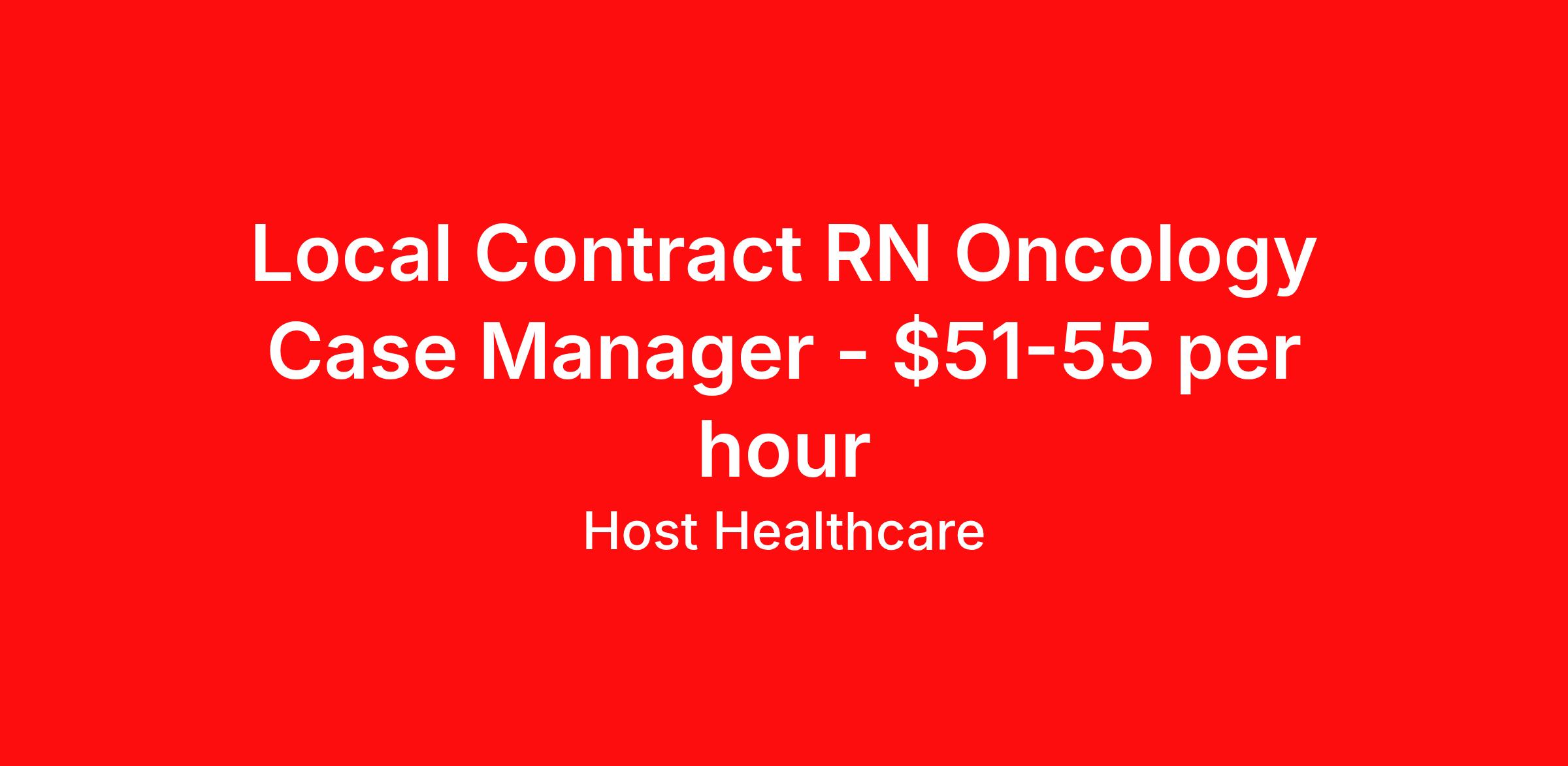 Host Healthcare is seeking a local contract nurse RN Oncology for a local contract nursing job in Irvine, California. Job Description & Requirements Specialty: Oncology Discipline: RN Start Date: 03/23/2026 Duration: 13 weeks 40 hours per week Shift: 8 hours, days Employment Type: Local Contract Host Healthcare Job ID La1fVX000002anyjYAA. Pay package is based on 8 hour shifts and 40 hours per week (subject to confirmation) with tax-free stipend amount to be determined. Posted job title: RN - Case Management About Host Healthcare At Host Healthcare, we provide a truly comfortable experience as you explore your travel nursing, therapy, or allied career. We make your travel healthcare journey easy by taking care of all the details, so you don’t have to. We are on a mission to help others live better and we do this by helping the healers of the world be as comfortable as possible. With access to tens of thousands of travel nursing, therapy, and allied jobs in all 50 states, our responsive and friendly recruiters find your dream position based on what’s important to you. During your assignment, get access to premium benefits, including Day 1 medical that continues up to 30 days between assignments, 401K matching, travel reimbursements, dedicated housing support, and more. We also offer 24/7 support from our team and access to our on-staff clinicians so you can feel comfortable and confident throughout your entire assignment. Travel comfortably with Host Healthcare. Benefits Referral bonus School loan reimbursement Vision benefits Wellness and fitness programs Company provided housing options License and certification reimbursement Life insurance Medical benefits Mileage reimbursement Pet insurance Discount program Employee assistance programs Guaranteed Hours Health savings account Holiday Pay 401k retirement plan Continuing Education Dental benefits