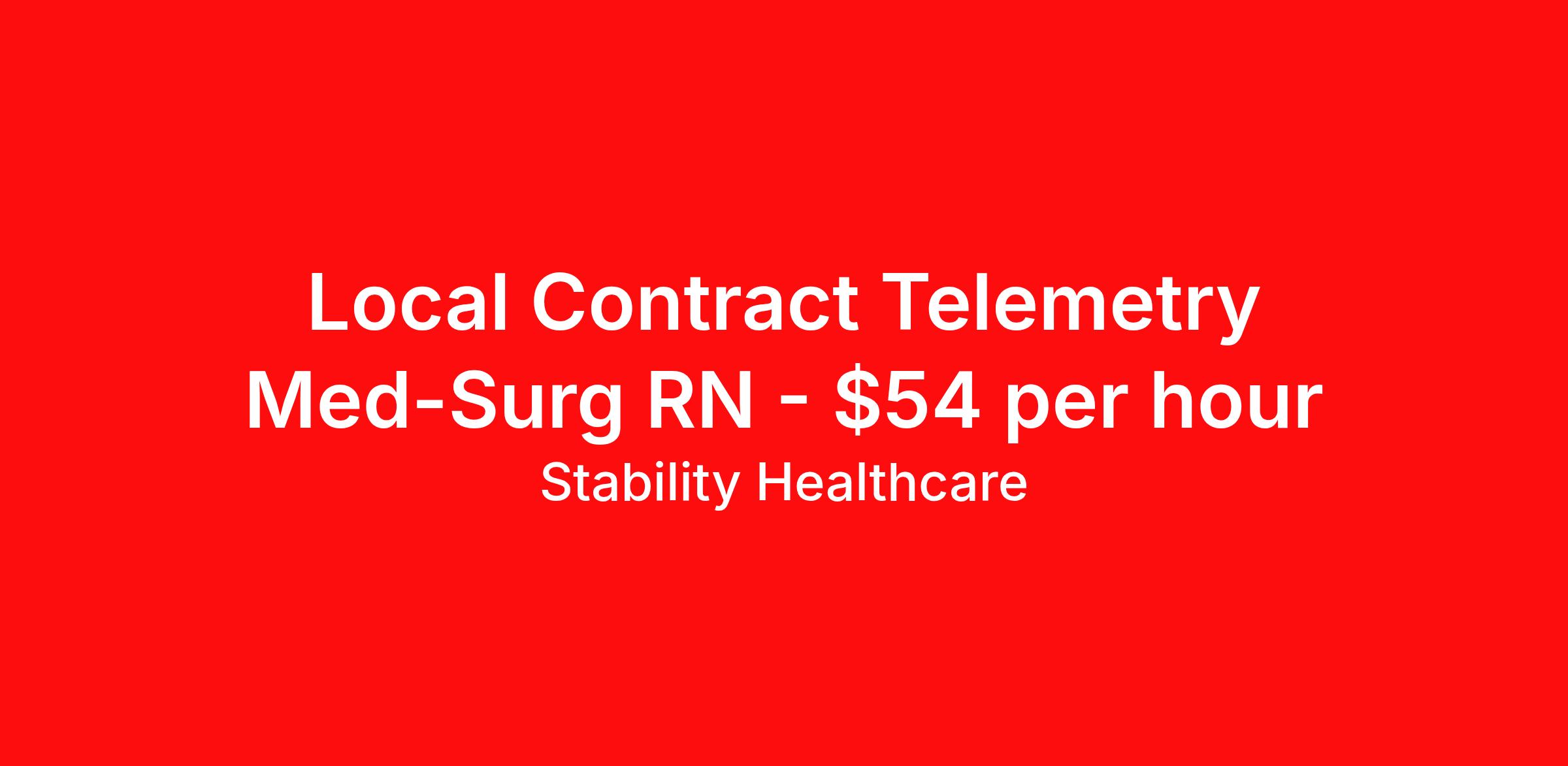Stability Healthcare is seeking a local contract nurse RN Med Surg / Telemetry for a local contract nursing job in Newburgh, Indiana. Job Description & Requirements Specialty: Med Surg / Telemetry Discipline: RN Duration: 13 weeks 36 hours per week Shift: 12 hours, nights Employment Type: Local Contract Stability Healthcare is looking for a Tele Med-Surg RN contract position in Newburgh, IN. The Medical Surgical Telemetry Registered Nurse (RN) provides direct nursing care in accordance with established policies, procedures and protocols of the healthcare organization often specializing in Neuro, Ortho or Cardiac patients. *$600 travel bonus *Day 1 health insurance with United Healthcare *PTO plan start accruing on day 1, use during contract or cash out at the end! *Guaranteed stipend if facility calls you off *Extra hour bonus earn an additional hourly bonus for working over your weekly contracted hours Stability Job ID L-826868. Pay package is based on 12 hour shifts and 36 hours per week (subject to confirmation) with tax-free stipend amount to be determined. Posted job title: Tele Med-Surg About Stability Healthcare Stability Healthcare was founded in 2009, with the mission of becoming the best Travel Nursing Agency in California. We have been rated one of the top travel nursing agencies and offer our nurses the highest paying travel nursing jobs available. We have access to the best travel assignments from 1000’s of facilities. You can start the year off in sunny California, spend the Spring in the Colorado Rockies, enjoy the Summer in the Mid-West, experience the change of seasons in Boston and New York, and hit the beaches of Florida in the winter. Our Nurses work in the best hospitals and health systems in the country. Benefits Guaranteed Hours Benefits start day 1